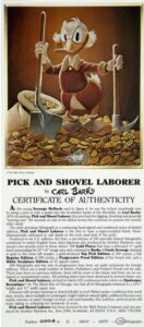 Common to all the Another Rainbow lithographs is the fact that they are hand-signed and numbered by Carl Barks and that they were all accompanied by an identically numbered certificate of authenticity. Below you can see an example of the mini litho entitled Pick and Shovel Laborer in all its various, officially released U.S versions.