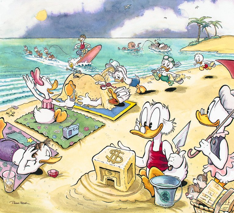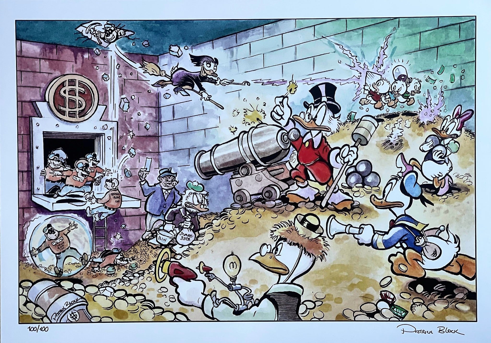 This lithograph is based on Patrick Block’s reinterpretation of Carl Barks’ classic image. Where Barks’ image was made in oil, Block’s imagef is rendered in watercolour, giving it a different – but equally beautiful – expression as the original.