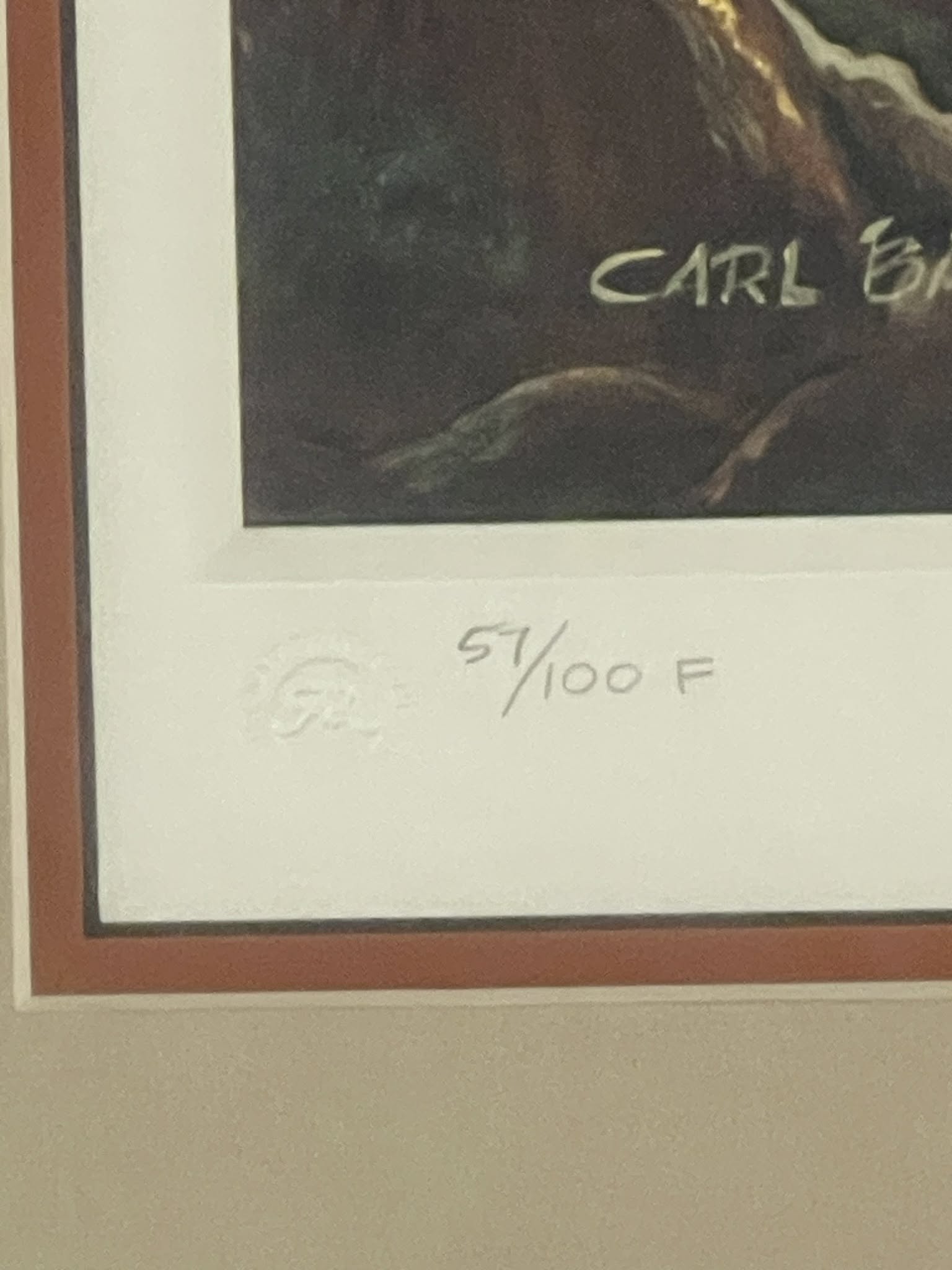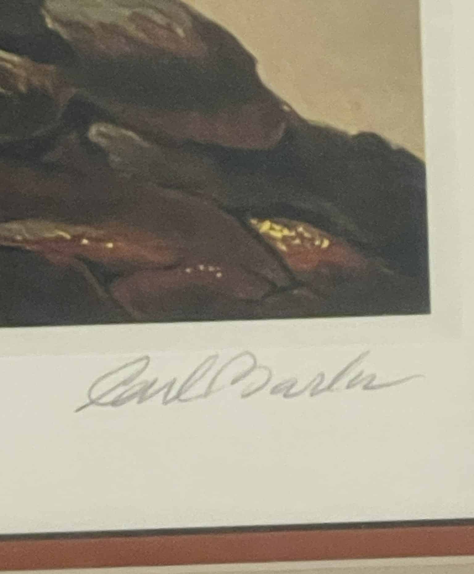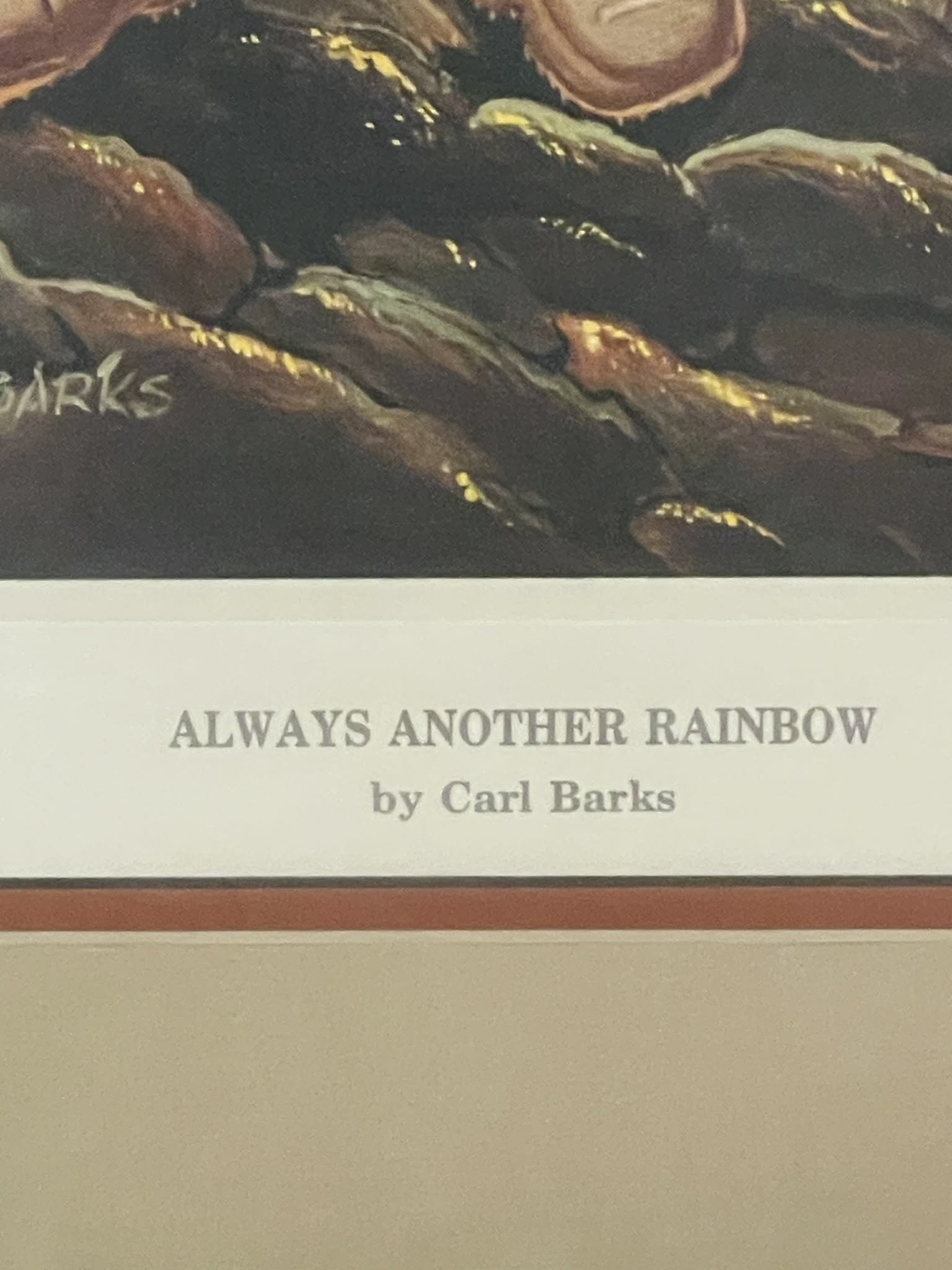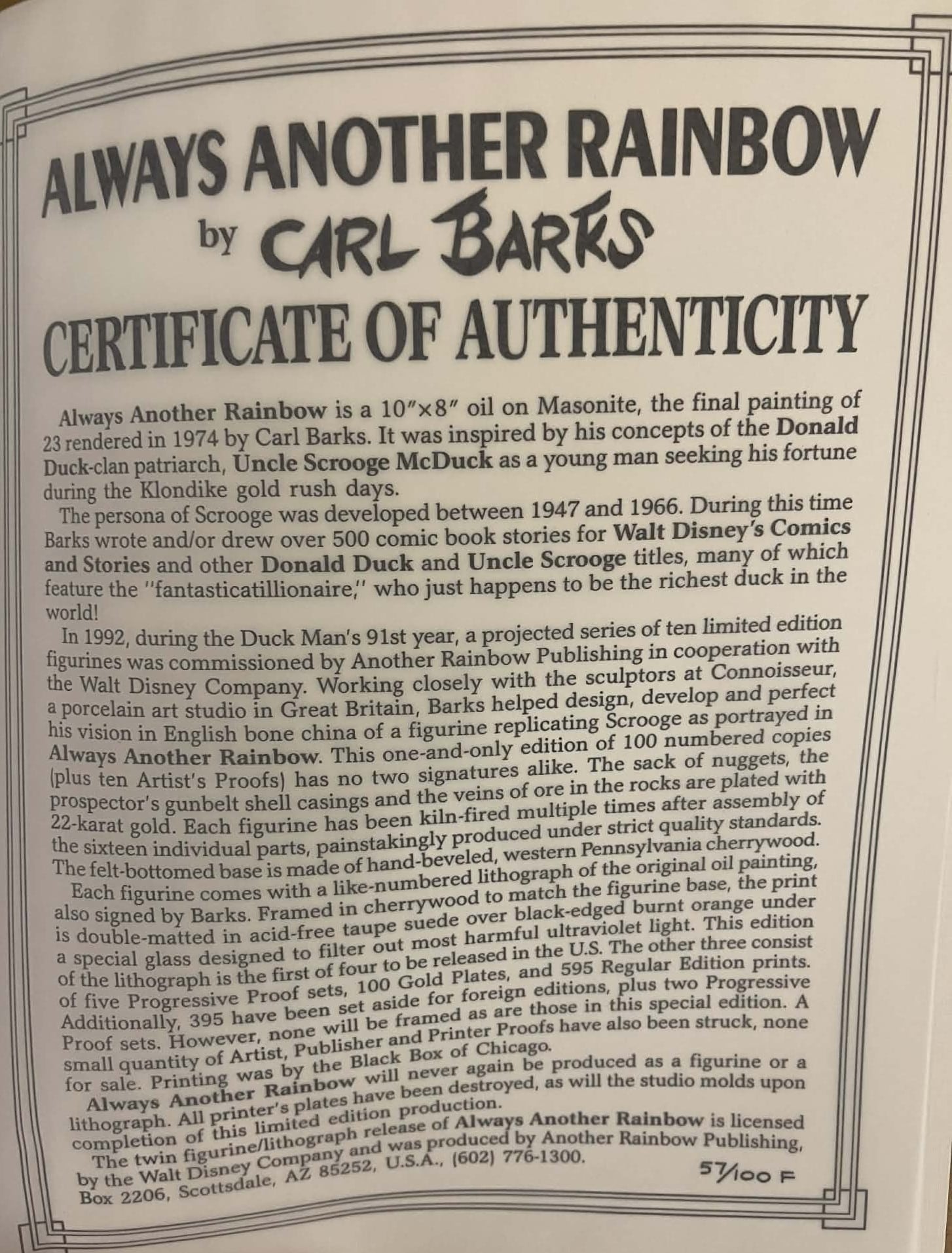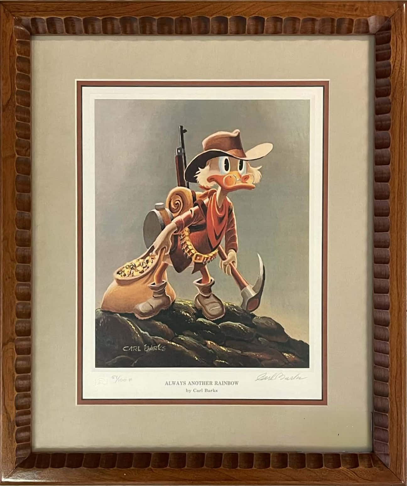This extremely rare and very beautiful figurine edition lithograph features a very special custom cherrywood frame and colored double mat. It is signed and numbered 57/100 F by Carl Barks. This litho originally accompanied a matching and identically numbered porcelain figurine. This special edition lithograph is accompanied by the original special edition of the booklet titled ‘Carl Barks and the Disney Ducks’ which includes the identically numbered certificate of authenticity. Both the lithograph and the CoA booklet appear to be in NM condition. The litho measures approx. 45 x 38 cm and comes in the original white shipping box. This is a highly desirable lithograph and an investment piece of choice for the picky collector!