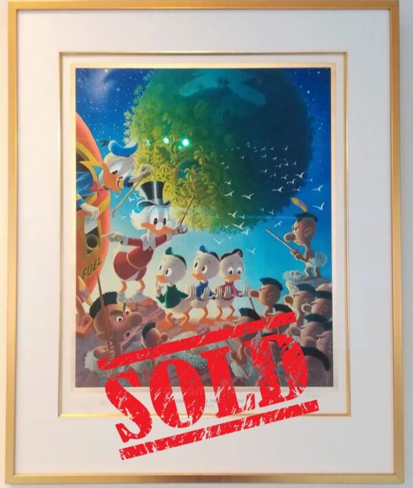 Gold Plate Edition lithograph released in 1990. Signed and numbered 24/100. Accompanied by the original certificate of authenticity and identically numbered special edition comic book (Island in the Sky). Professionally framed in the trademarked exclusive Gallery Disneyana+ gold frame to a total size of approx. 74 x 64 cm.