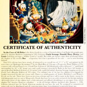 Gold Plate Edition lithograph released in 1990. Signed and numbered 24/100. Accompanied by the original certificate of authenticity and identically numbered special edition comic book (Island in the Sky). Professionally framed in the trademarked exclusive Gallery Disneyana+ gold frame to a total size of approx. 74 x 64 cm.