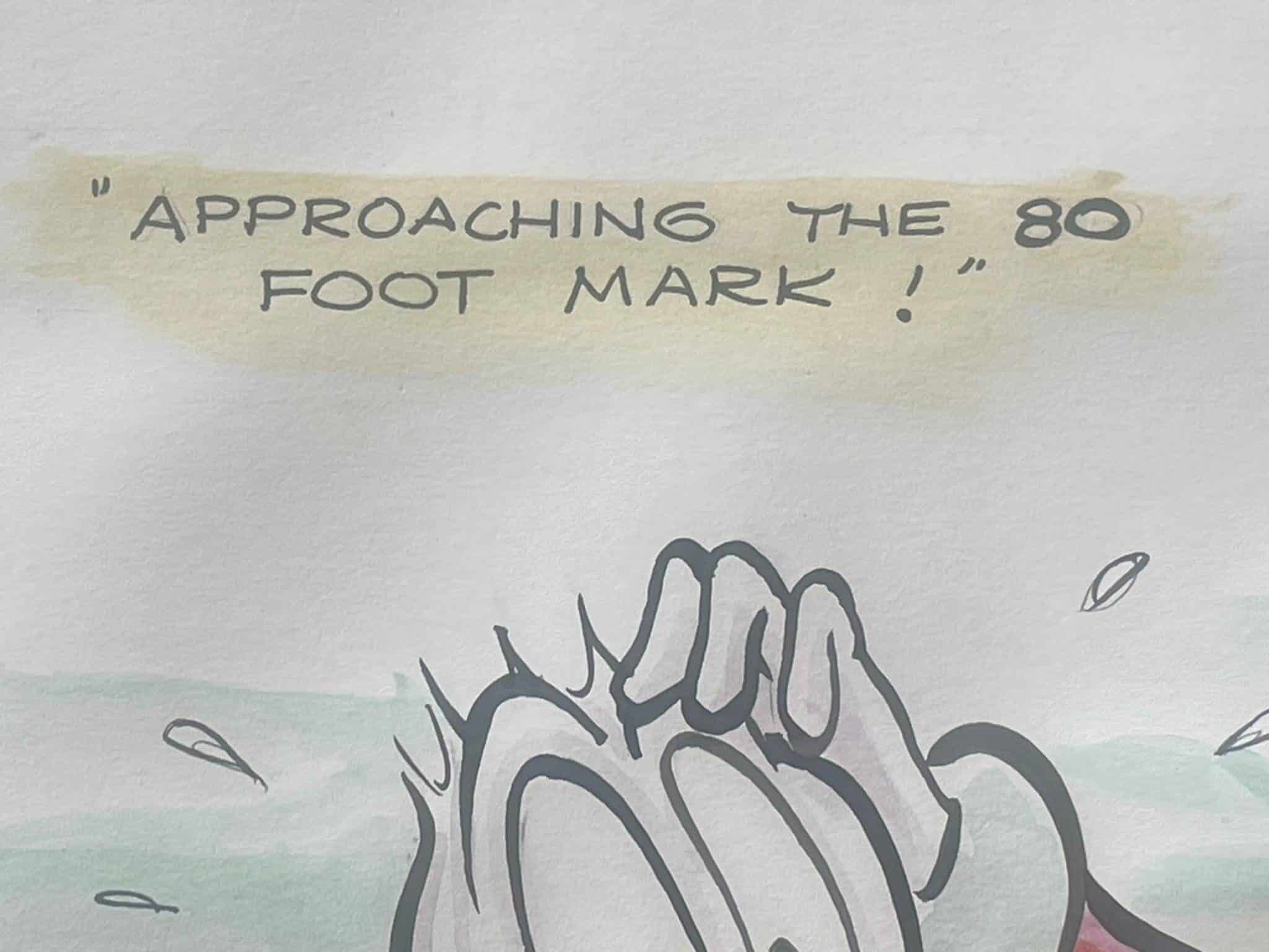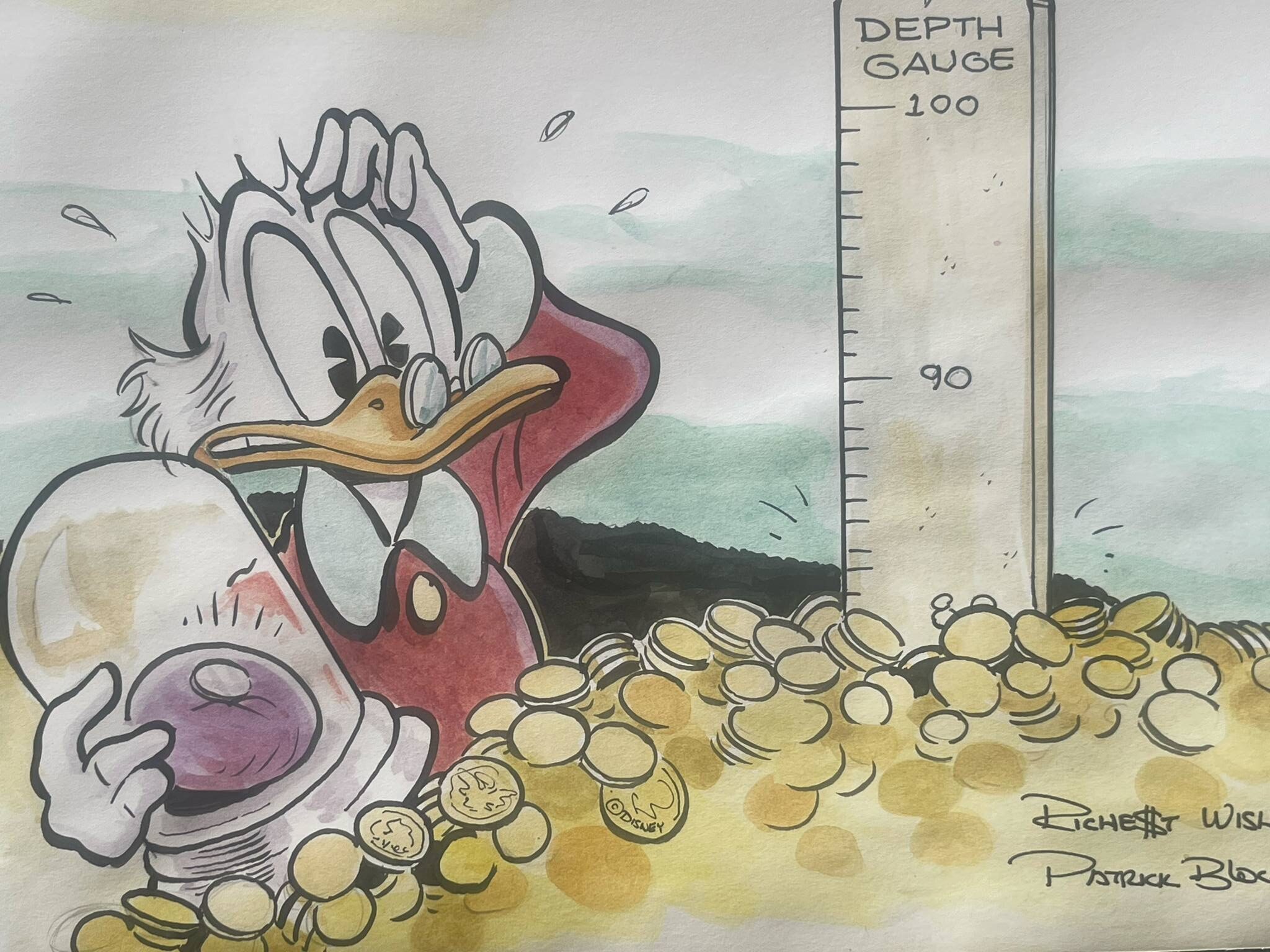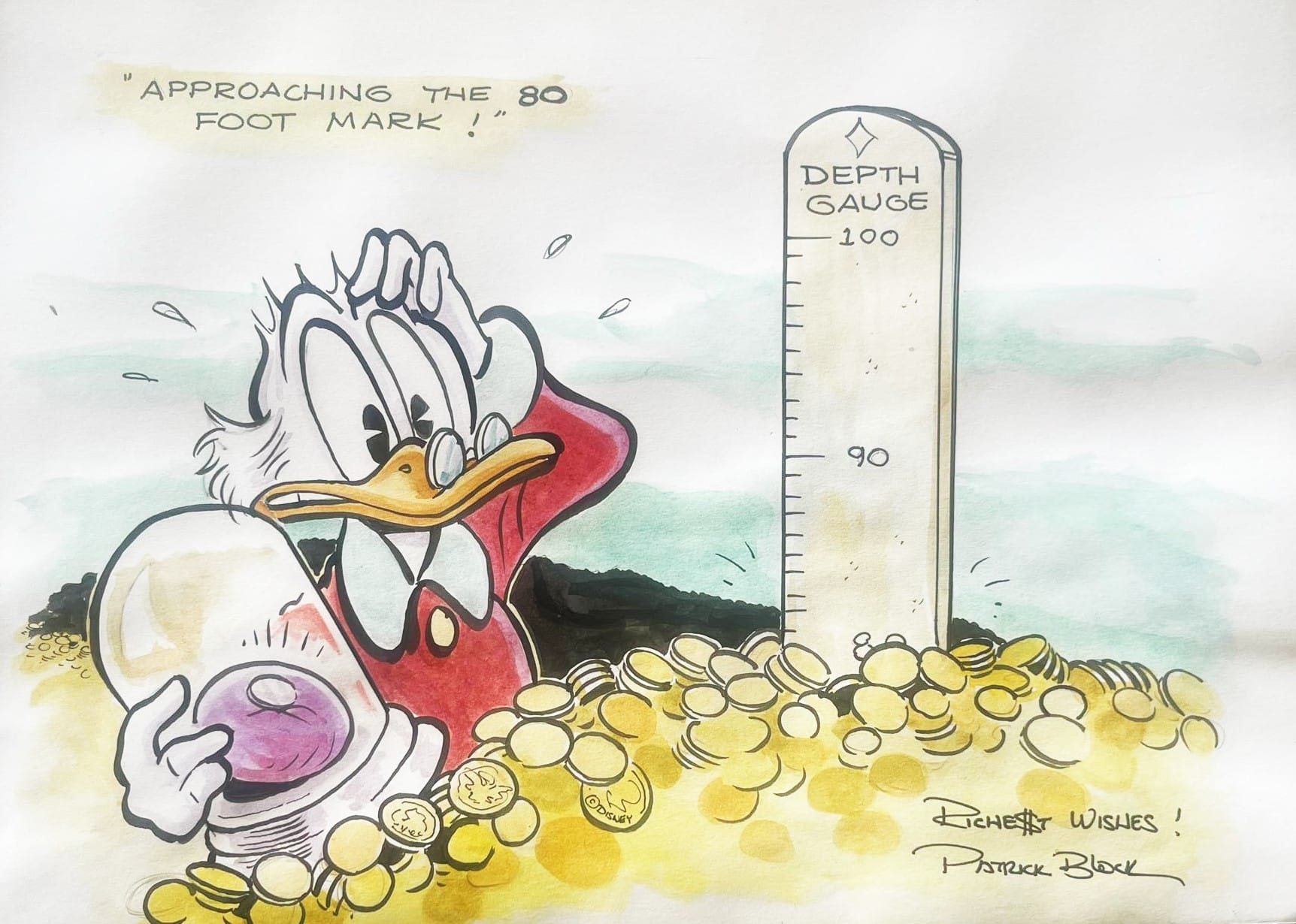Beautiful original money bin themed Scrooge McDuck watercolour by Patrick Block.  This lovely, hand-signed and hand-titled watercolour is rendered on high-quality art paper and measures  approx. 20 x 28 cm.