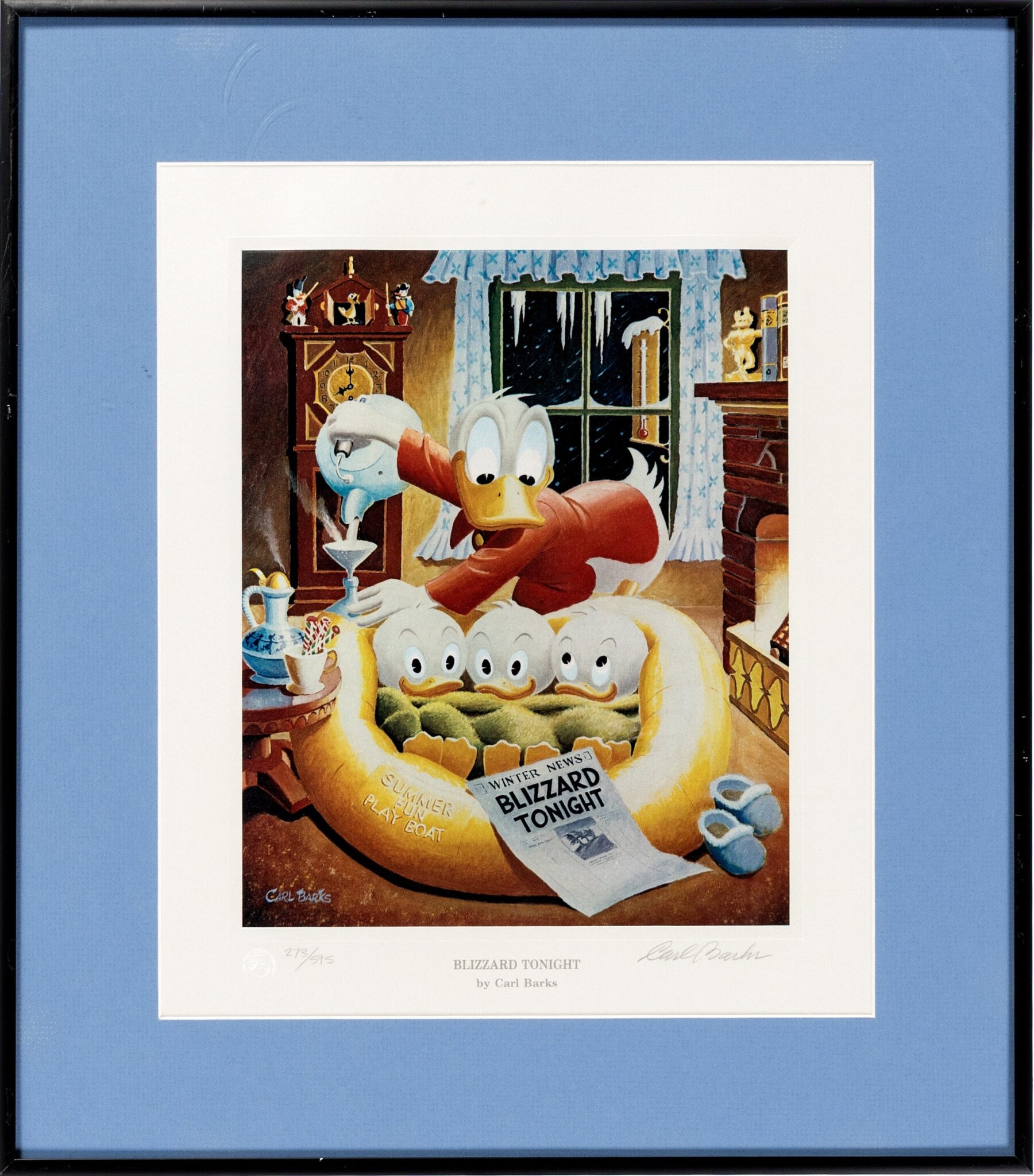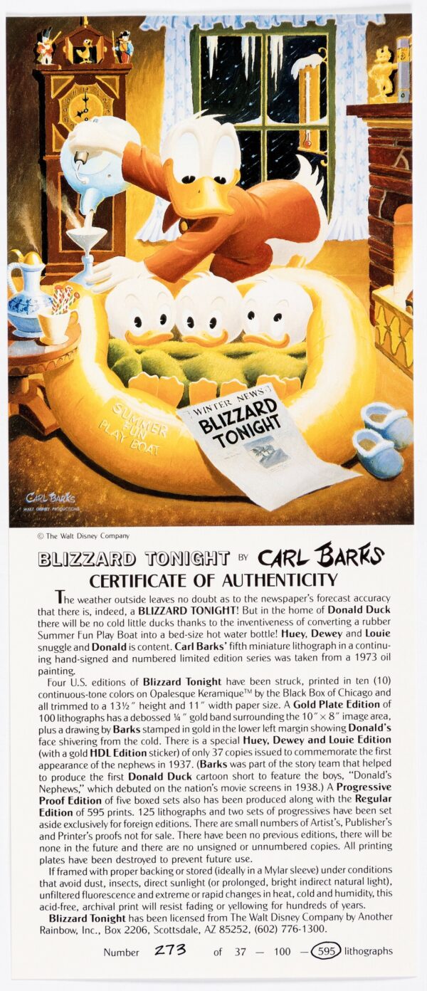 Home / Artists / Carl Barks / Lithographic works / Another Rainbow / Lithographs in Disney licensed frames / Blizzard Tonight – Regular Edition Blizzard Tonight – Regular Edition€1,000.00 1 in stock Blizzard Tonight - Regular Edition quantity Add to cart Categories: Carl Barks, Lithographic works, Lithographs in Disney licensed frames Description Description Beautiful Regular Edition lithograph released in 1993. The lithograph is signed and numbered 273/595 and accompanied by the original certificate of autheticity from Another Rainbow. Framed to a total size of approx. 45 x 40 cm. Related products Fifty Stingy Years Worth – tile set, including prototype0 out of 5 Read more The Fine Art of Walt Disney’s Donald Duck by Carl Barks – Royal Blue Binding0 out of 5 Read more Return to Plain Awful – Gold Plate Edition0 out of 5 €1,750.00 Add to cart Purple Persia0 out of 5 €2,500.00 Add to cart