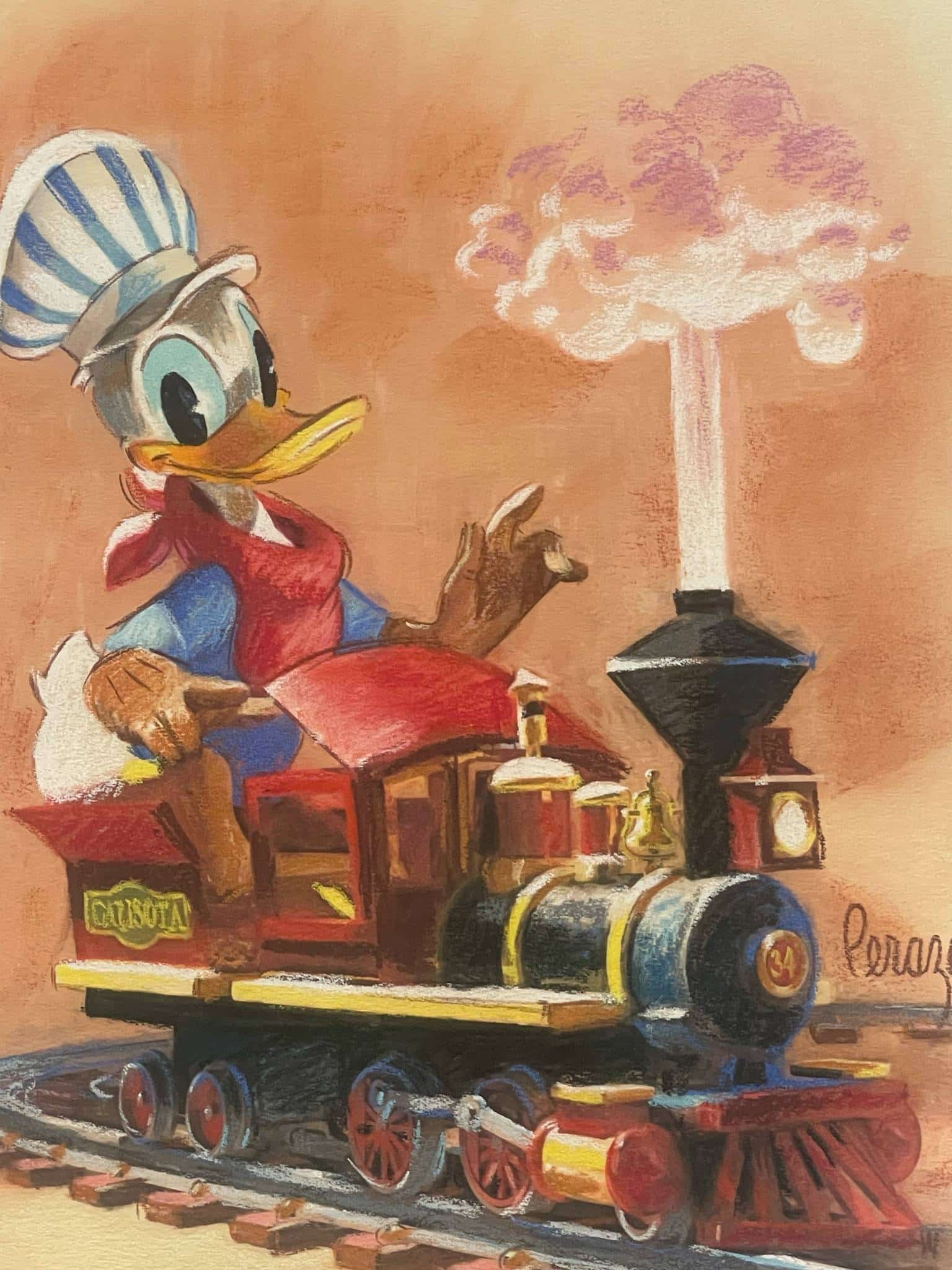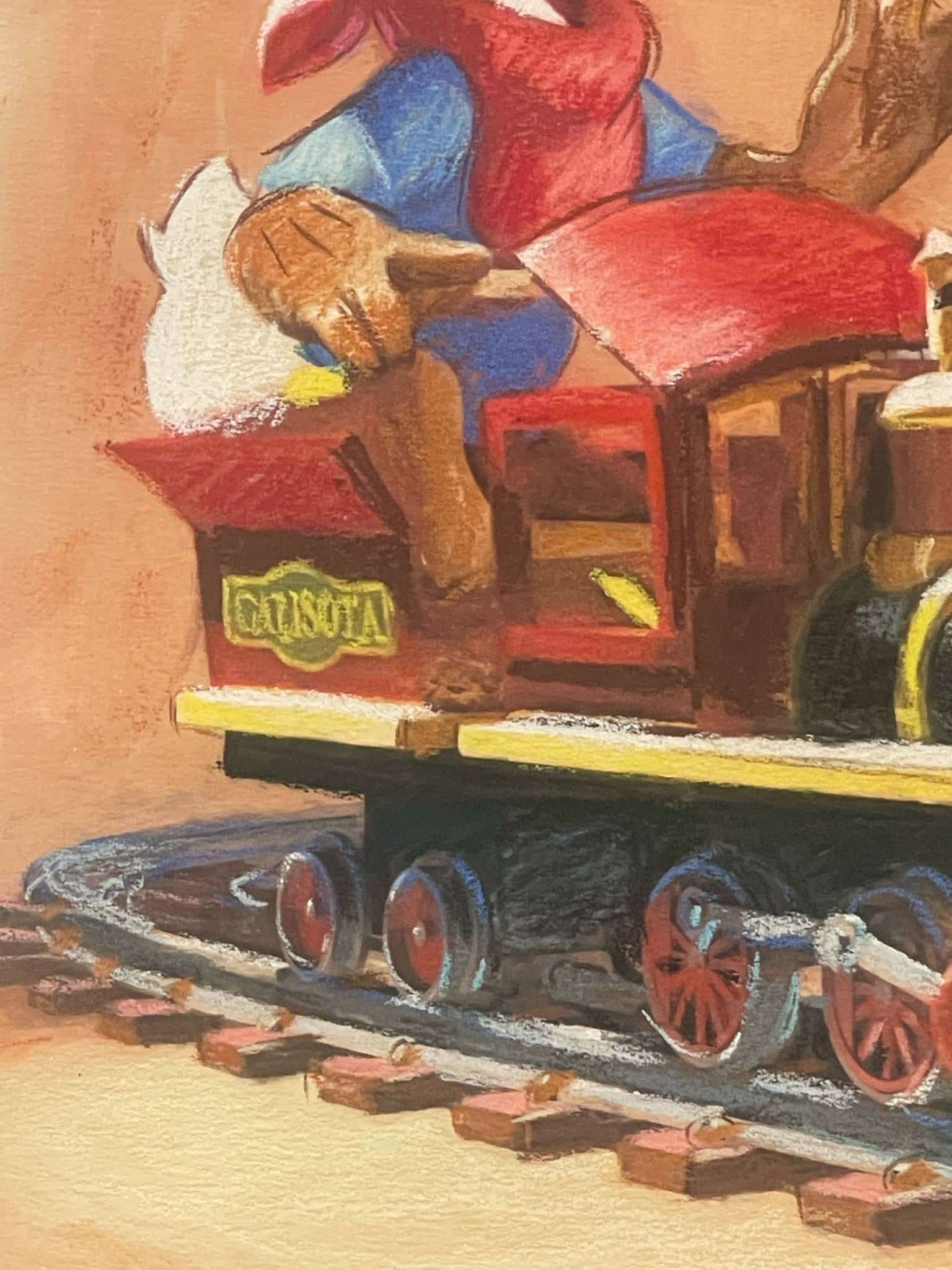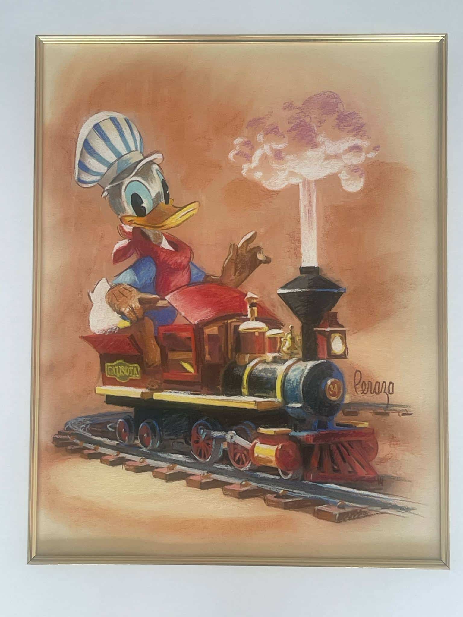 Exquisite pastel by Mike Peraza featuring a spiffy looking Donald Duck giving it his all as a toy train master. This artwork is professionally framed in the trademarked exclusive Gallery Disneyana+ gold frame to a total size of approx. 55 x 45 cm and is hand-signed by the artist. Mike Peraza’s pastels are few and far between on the secondary art market, making this a very rare chance to add one of this Disney master artist’s immensely beautiful originals to your collection.
