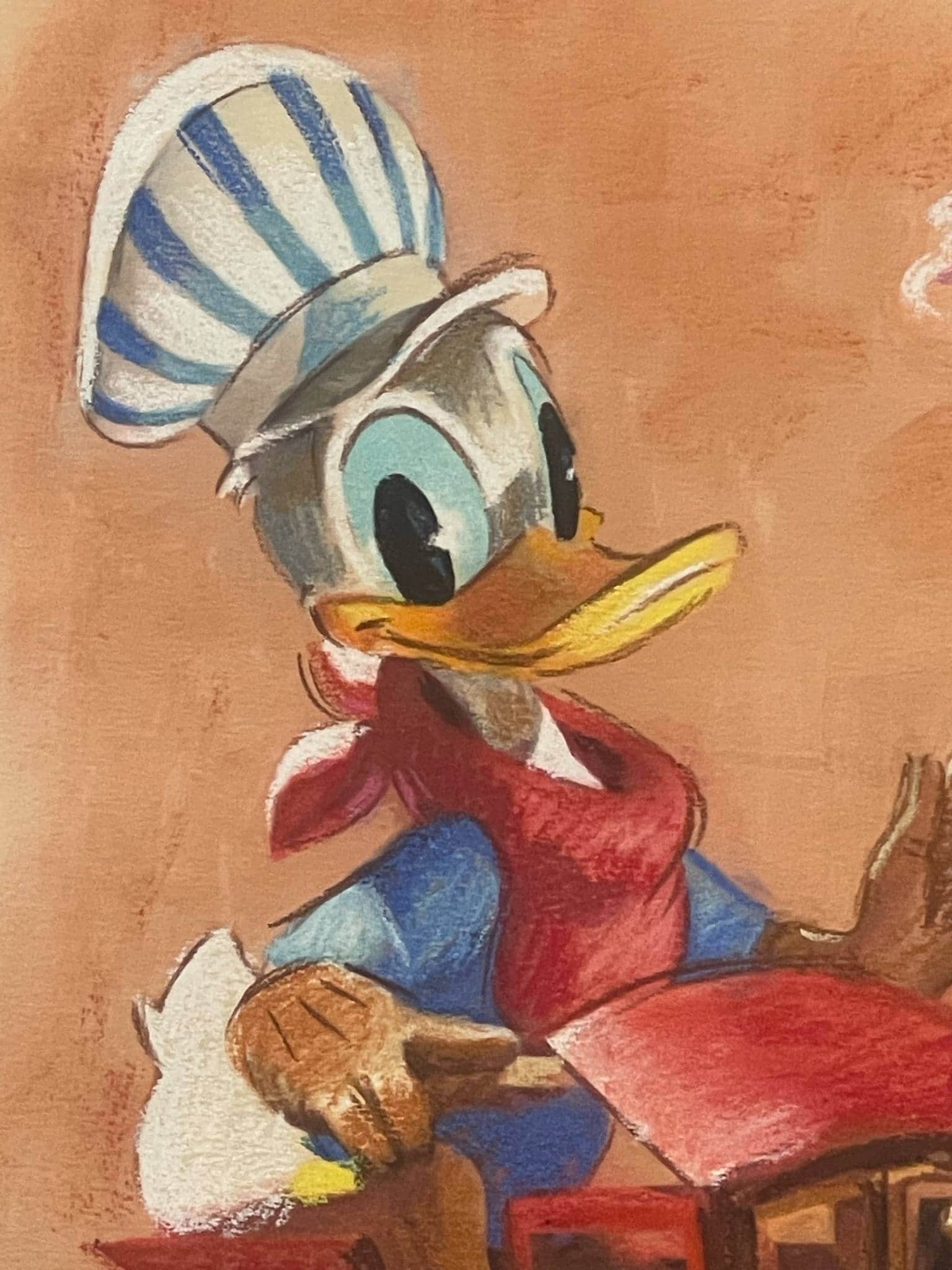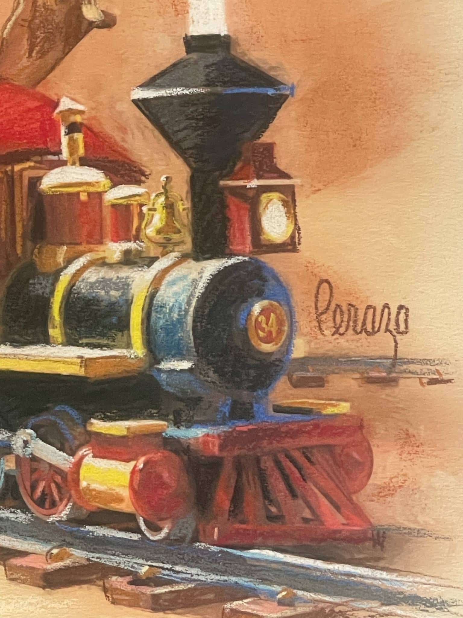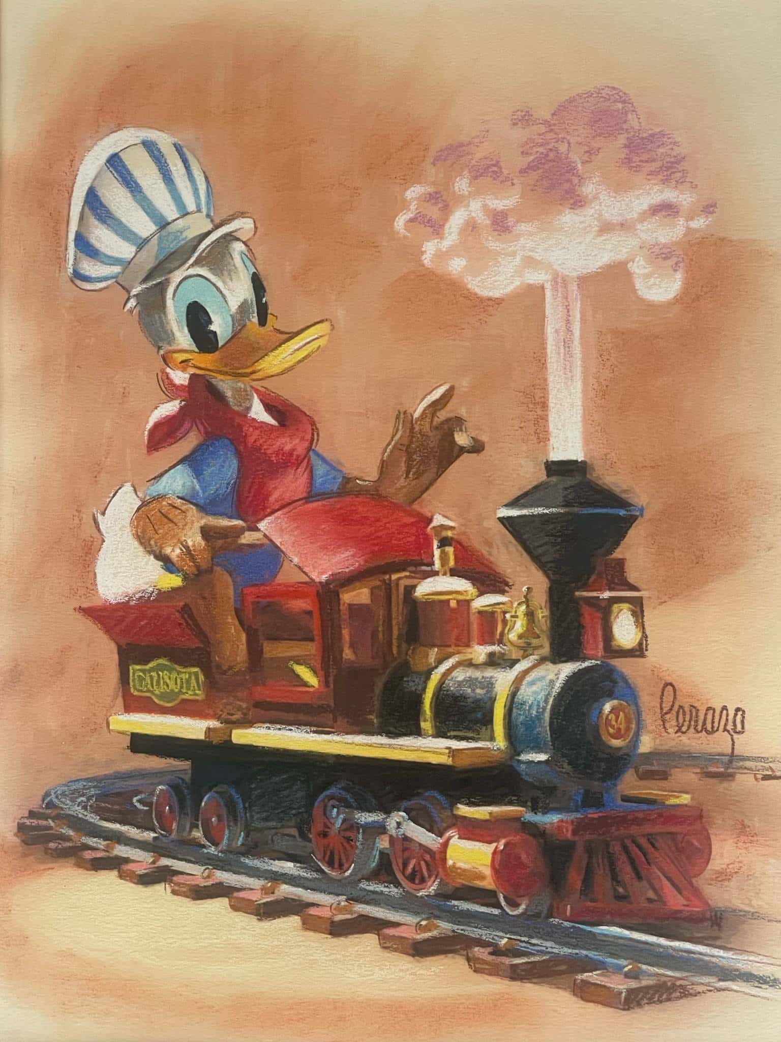 Exquisite pastel by Mike Peraza featuring a spiffy looking Donald Duck giving it his all as a toy train master. This artwork is professionally framed in the trademarked exclusive Gallery Disneyana+ gold frame to a total size of approx. 55 x 45 cm and is hand-signed by the artist. Mike Peraza’s pastels are few and far between on the secondary art market, making this a very rare chance to add one of this Disney master artist’s immensely beautiful originals to your collection.