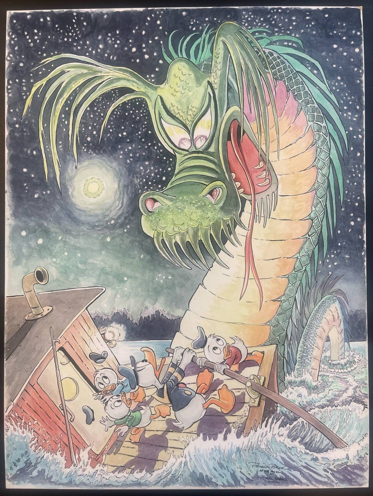 Carl Barks, the “Good Duck Artist,” defined the world of Donald Duck and Uncle Scrooge with his timeless storytelling and vivid oil compositions. In this tribute, Block honours Barks’ legacy by reimagining select masterpieces through his own artistic lens, using delicate brushwork and rich watercolour technique to breathe new life into iconic scenes.