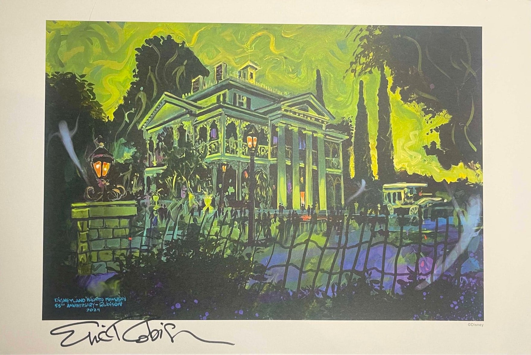 Beautiful art print featuring the iconic Haunted Mansion from Disneyland. The print measures approx. 30 x 45 cm and was released excluively at the 2024 D23 Disney Expo in Anaheim. It is made on heavy 300-gram paper stock and is hand-signed by Eric Robison.