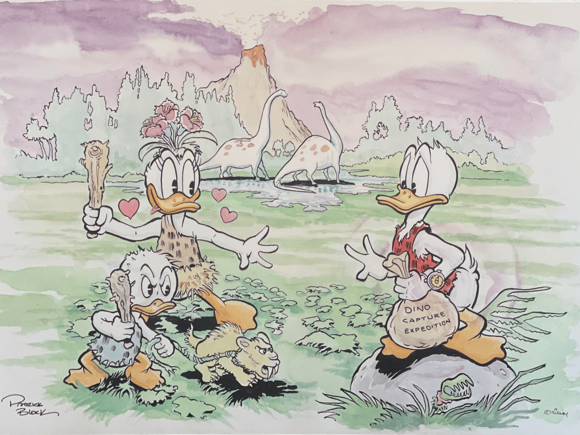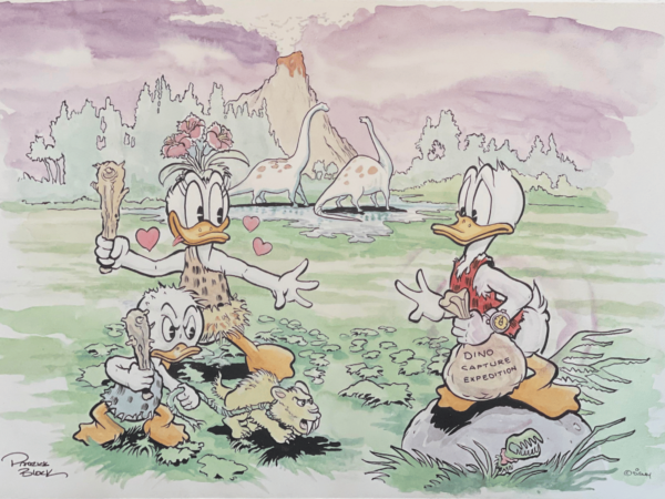 In this beautiful watercolour from Patrick Block’s Epic Donald project, Donald spark a love interest from a pre-historic Daisy. This beautiful watercolour is made on sturdy crescent boad and measures approx. 25.5 x 38 cm and is hand-signed by Block.
