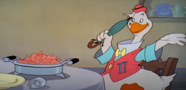 Donald’s freeloading cousin Gus sits down at the dinner table, ready to eat everything in sight, in this funny Jack King-directed short. In this original 12 field 5-peghole animation drawing, he’s about to spear a batch of doughnuts with his umbrella.