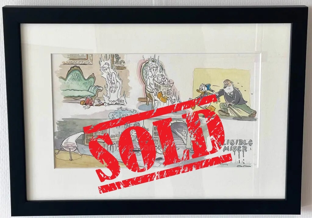 Beautiful concept art in watercolour and coloured pencil used for the Epic Donald game that was sadly never released. In “Eligible Miser”, Scrooge and the boys see a little old model of a Victorian Mansion in the window of an antique store, and Scrooge buys it for his museum. It turns out to be haunted by a single little old spinster ghost lady who developes a crush on Scrooge and wants him to reside with her forever. Donald has to find a way to rescue Scrooge from her cookie baking nebulous clutches.