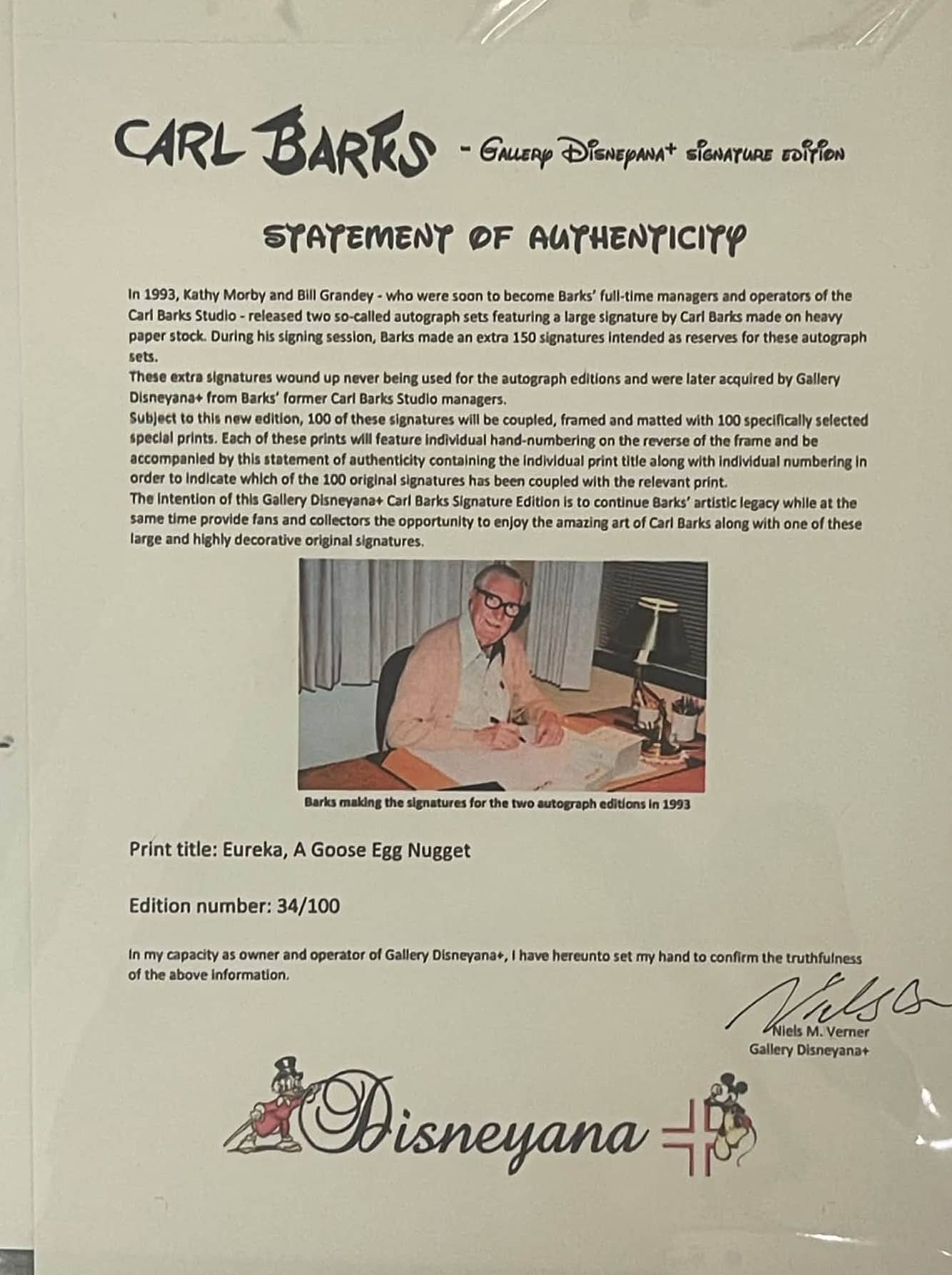 The Carl Barks Signature Edition by Gallery Disneyana+ is a new limited edition series consisting of a total 100 specially selected prints matched with an original oversize Carl Barks signature. The aim of this special edition is to carry on Carl Barks’ artistic legacy as a supplement to the officially released lithographic Carl Barks editions. The CBSE will thus not contain images or scenes previously released in another limited edition lithographic format. Each print is individually numbered on the reverse of the frame and accompanied by an identically numbered and individually titled CoA from Gallery Disneyana+ documenting the origin of the Carl Barks signature. The scene offered here is titled ‘Eureka, A Goose Egg Nugget!’. This is a high-end, exclusive fine-art giclée print professionally framed in a custom specialty with museum-quality glass to a total size of approx. 61 x 49 cm. This version is scaled to be the ideal companion to the identically titled porcelain figurine.