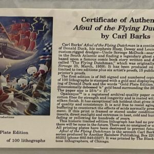 This glass etching was presented to Carl Barks on the occasion of his 96th birthday in 1997 and thus comes from his personal collection. The unique red base with the imprint ‘Happy 96th Birthday Carl Barks!’ was designed by Dan Bascobert. The sculpture is marked as “Final Proof” and shows the famous scene where Scrooge McDuck finds his first goose egg nugget. The etching measures approx. 30 x 30 cm (and stands 45 cm tall in the base) and is approx. 1 cm thick. The glass sculpture is accompanied by a letter of authenticity from the Carl Barks Studio.
