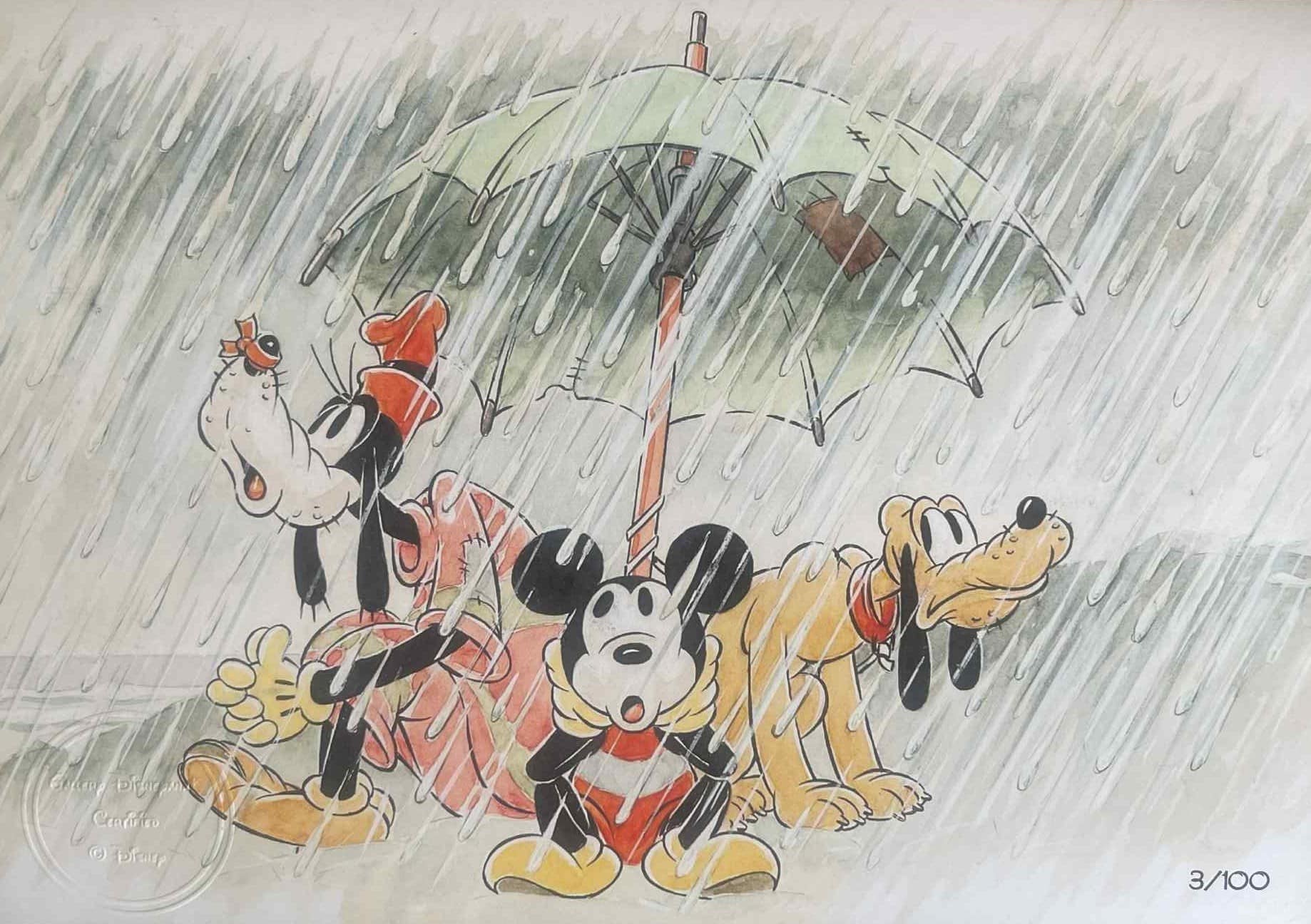 Created by Disney Legend Tom Wood in 1938, this vibrant piece transports viewers into a classic scene featuring 3 of Disney’s fab five characters, Mickey, Goofy and Pluto, stuck on a far from ideal beach trip.