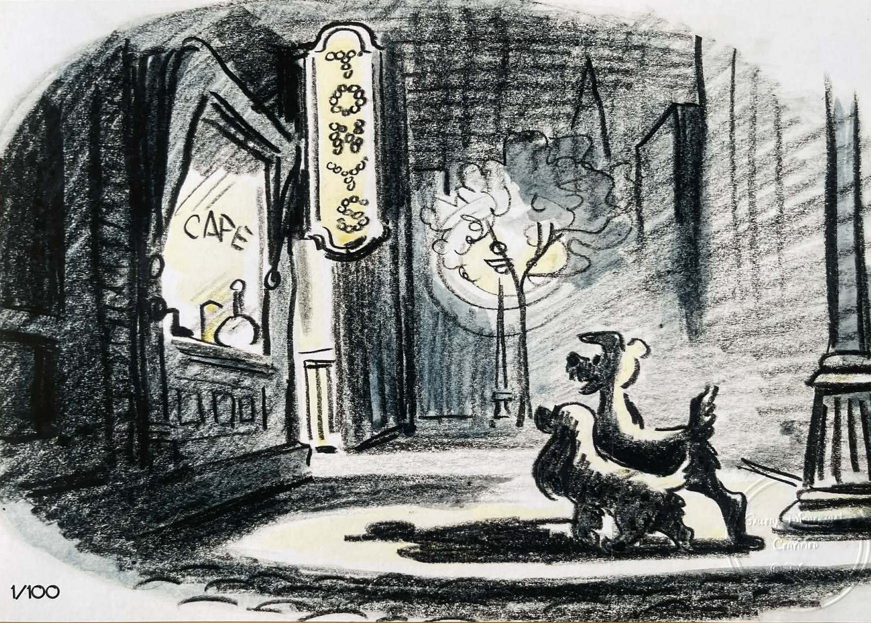 “Hey, Tony’s! Of course, the very place for a very special occasion. No, this way, Pidge. I have my own private entrance!” “Footloose and collar-free” Tramp leads Lady to one of his favorite places for a handout, Tony’s Restaurant (seen here as “Tony’s Café”). Soon, their romantic “Bella Notte” evening will begin! This is an absolutely charming piece of Lady and the Tramp artwork