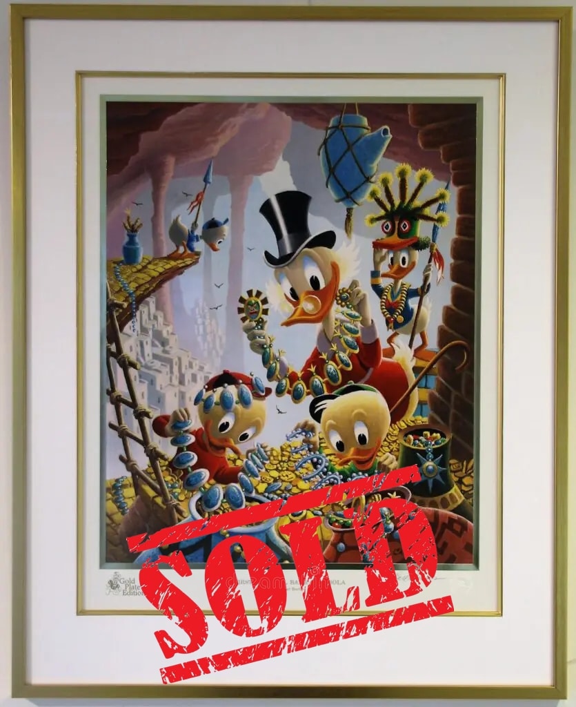 Beautiful lithograph based on the 1954 Barks story titled “The Seven Cities of Cibola”. Released in 1987. Signed and numbered 24/100. Accompanied by the original certificate of authenticity. Professionally framed in the trademarked exclusive Gallery Disneyana+ gold frame to a total size of approx. 75 x 65 cm.