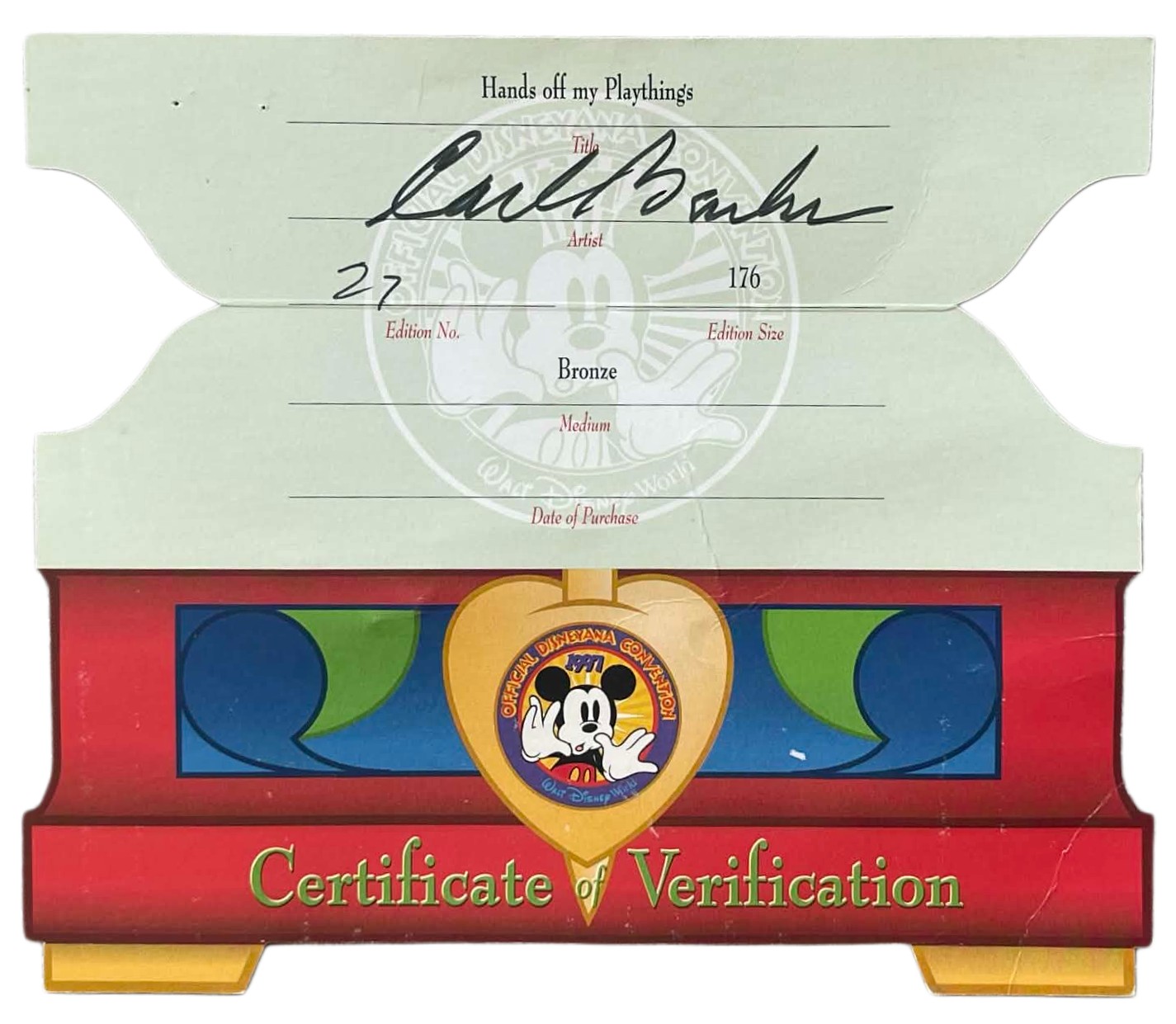 Produced in a strictly limited edition of just 176 units measuring approx. 34 cm in height, each piece is individually numbered (this is number 27), and accompanied by a certificate of authenticity signed by Carl Barks, ensuring its status as a true collector’s item. Whether displayed in a private collection, gallery, or office, Hands Off My Playthings stands as a bold statement piece that draws attention and sparks conversation.