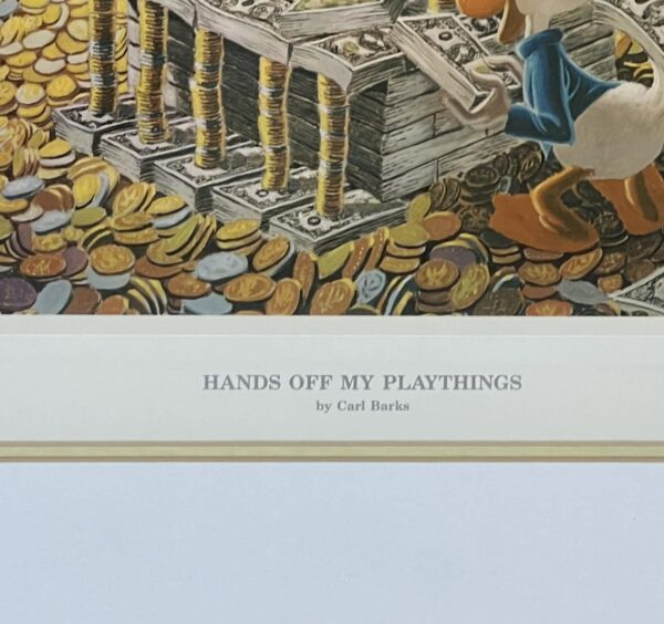Regular Edition #24/345 and hand-signed by Carl Barks. Released in 1998. Measures approx. 65 x 70 cm. The lithograph is accompanied by the original, identically numbered CoA from Another Rainbow. This money-bin scene was Barks’ personal favourite.