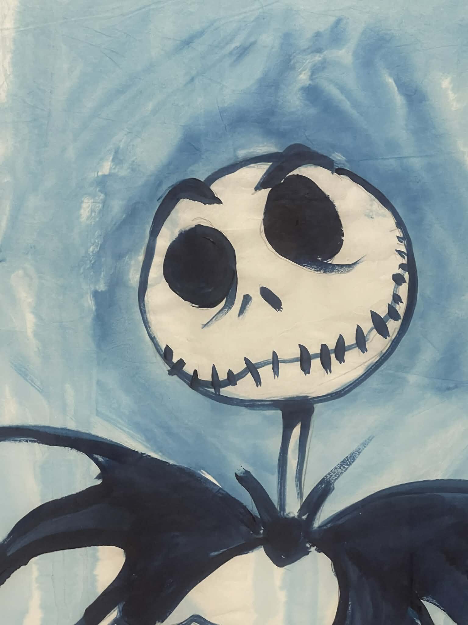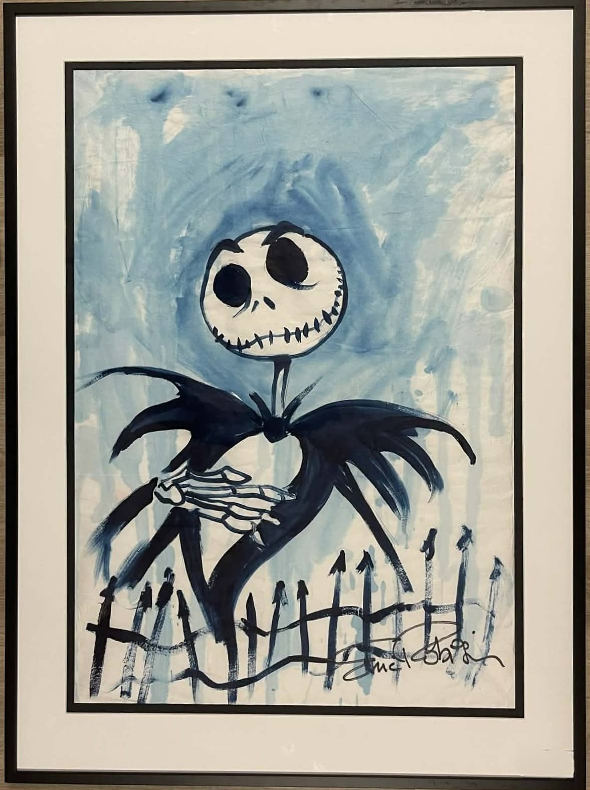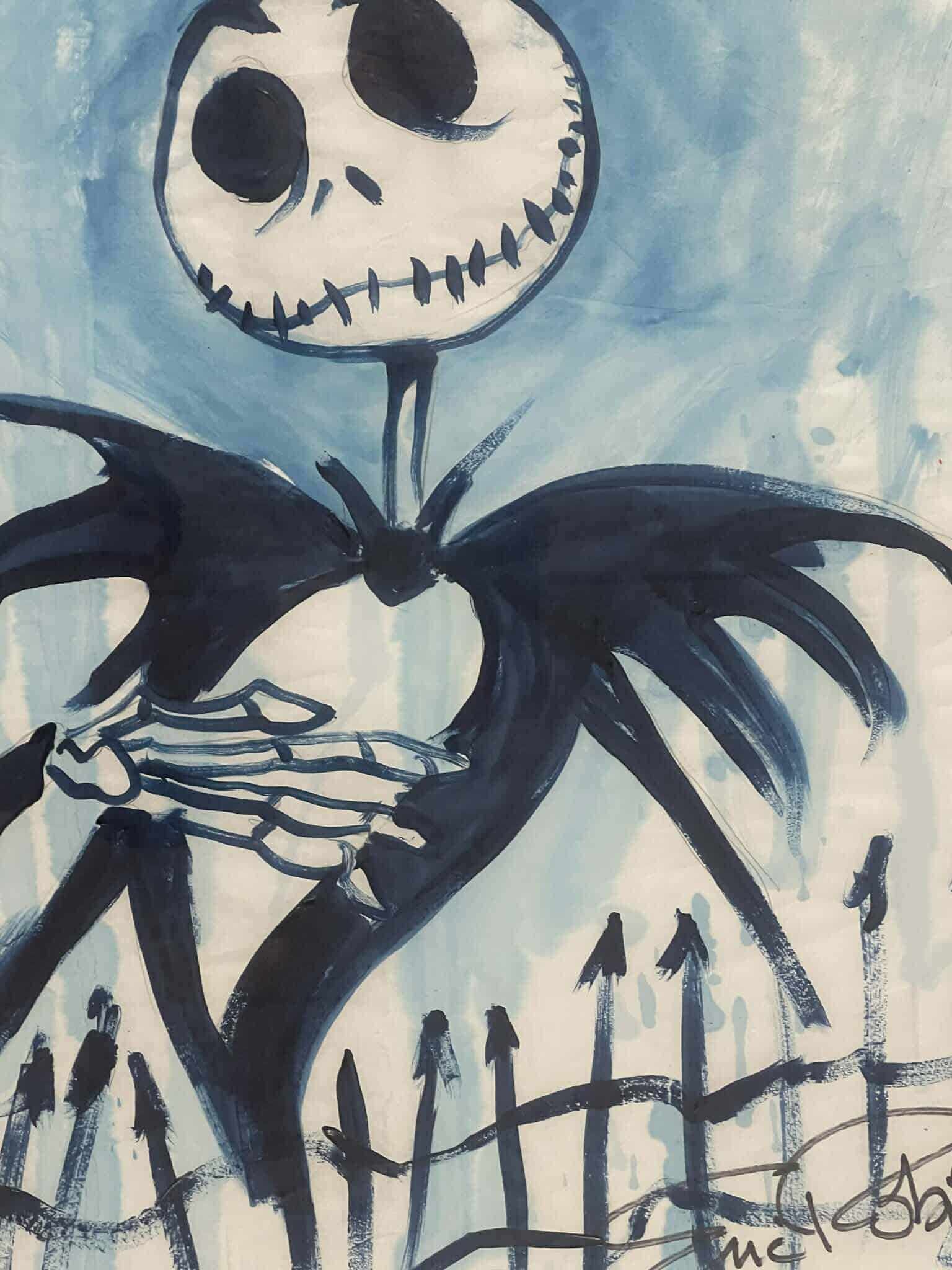 Large original painting study from 2025 featuring Jack Skellington rendered in paint, ink and marker on art paper. It has been professionally framed to a total size of 105 x 79 cm. The artwork is hand-signed by Robison.