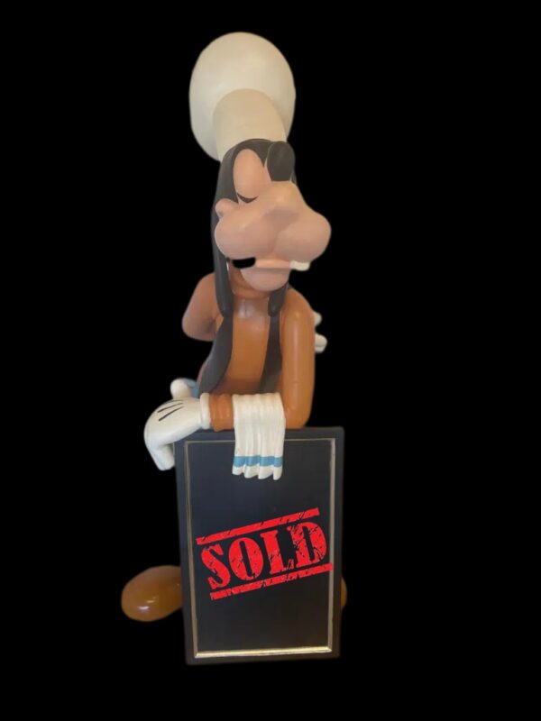 Finding Disney big figs on the collectibles market is beyond hard. Finding a life-size statue such as this Goofy can be nearly impossible. This impressive Goofy as a chef (with accompanying menu board) stands a whopping 142 cm tall. The statue is in very good condition with only a few minor flaws in the form of a minor tear and a few flakes of paint loss – all of which are shown in the photos. No major chips or breaks etc. Shipping to continental Europe only.