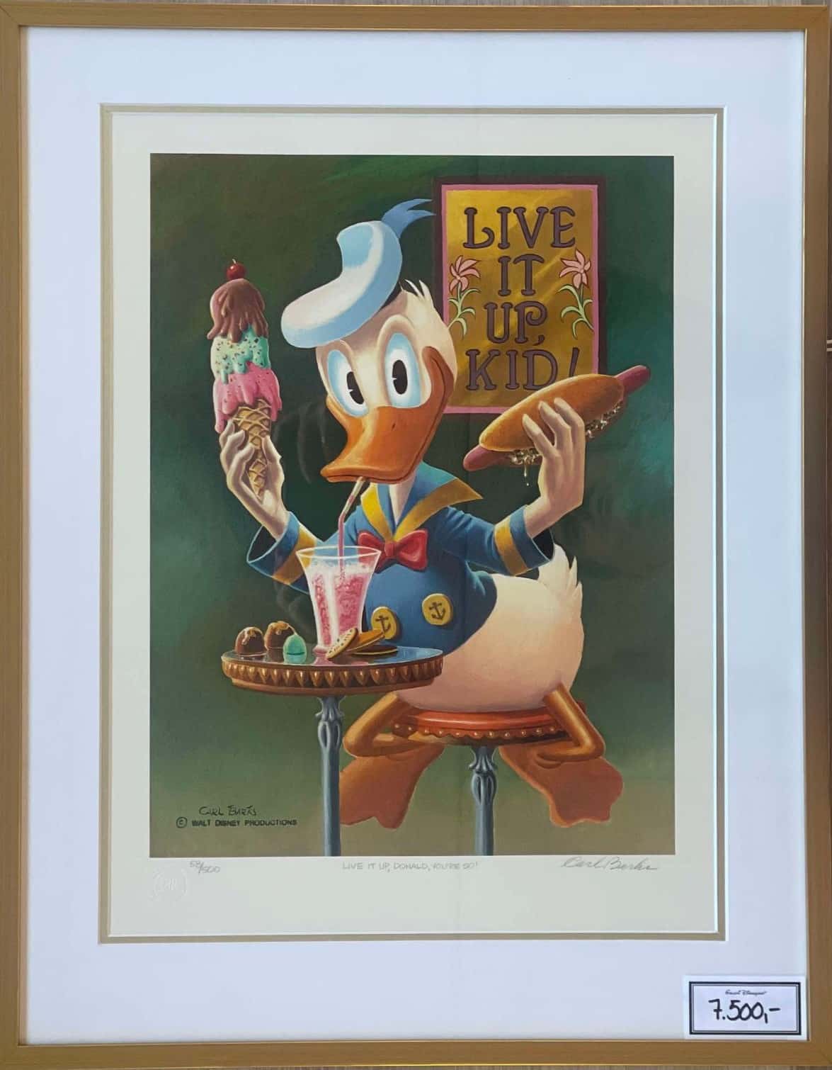 Medium-sized lithograph released in 1984 to commemorate the 50th anniversary of Donald Duck. Limited to a single edition of 500 signed and numbered copies of which this is number 58. The litho is professionally framed and matted to approx. 65 x 50 cm and is accompanied by the identically numbered CoA from Another Rainbow.