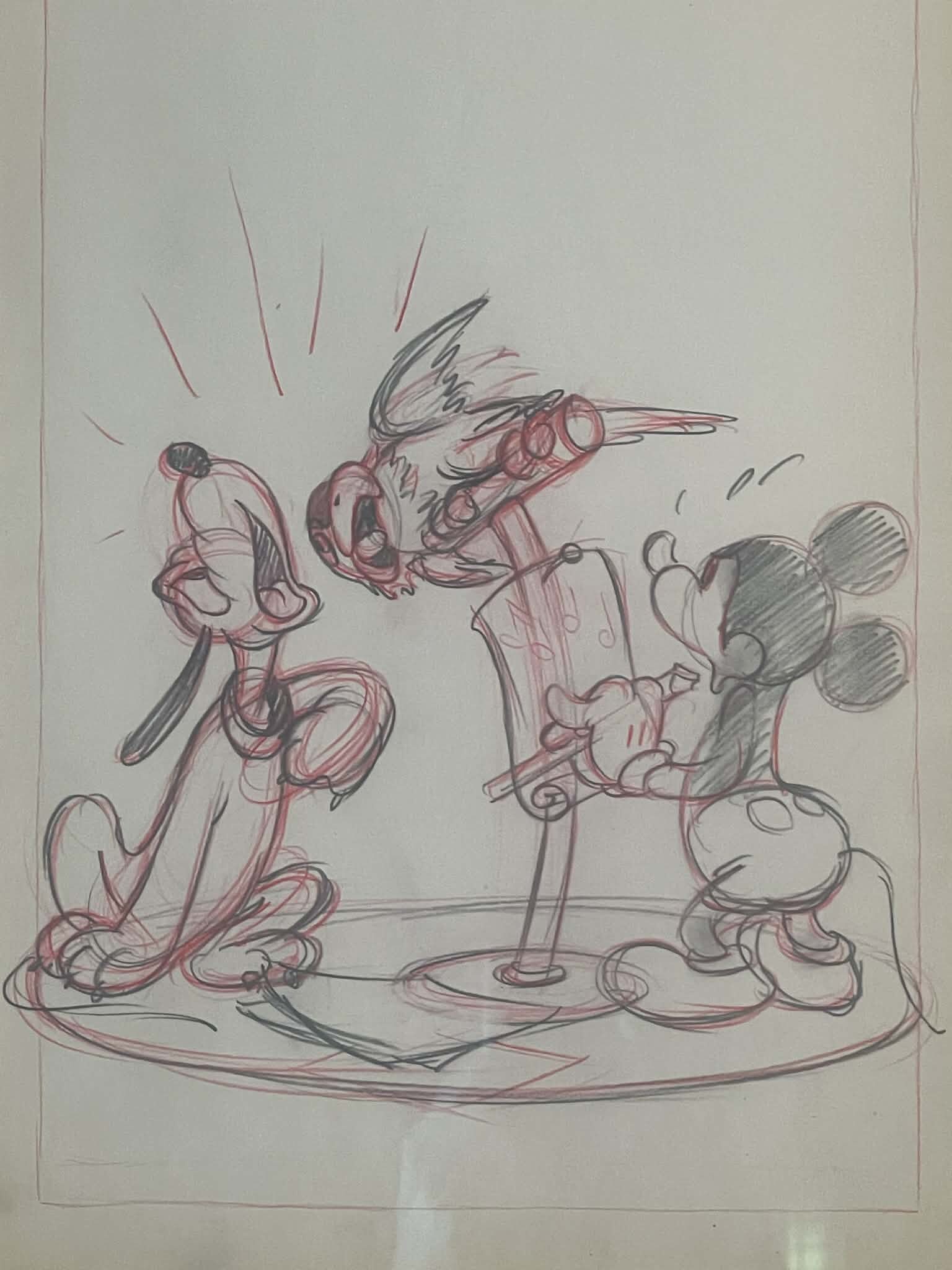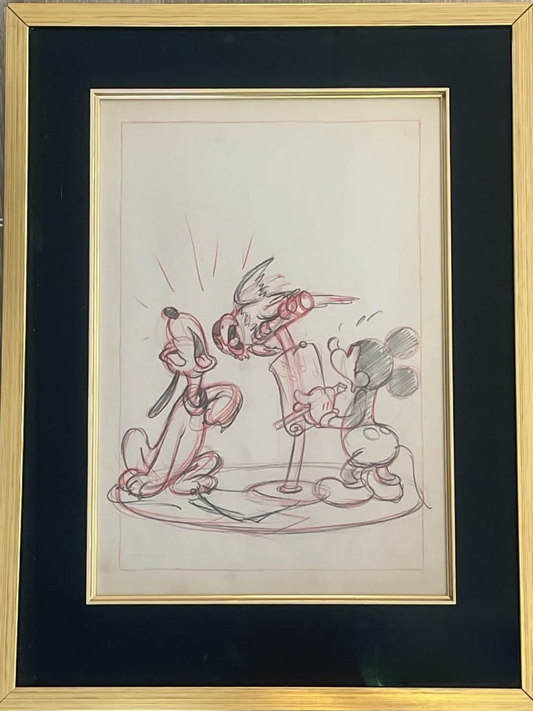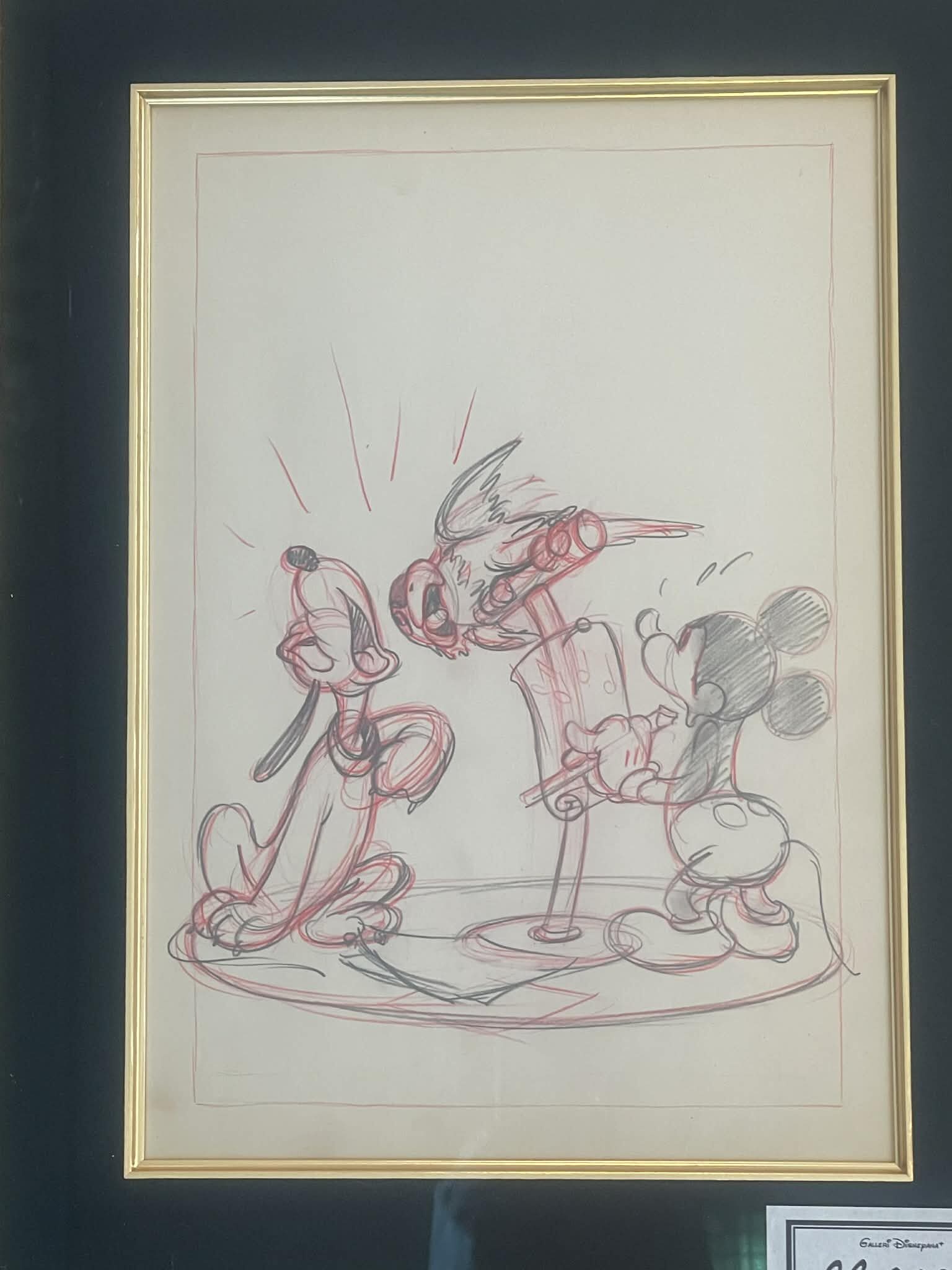 This detailed study featuring Pluto, Mickey and parrot was created by legendary Disney artist, Manuel Gonzales, in 1938 as a part of the creation process for the finished poster for the identically titled movie. The artwork is rendered in pencil on animation art paper which has been professionally framed in a gold frame with black mat and gold inner border to a total size of 41 x 32 cm. This beautiful piece of original art is accompanied by a certificate of authenticty from Gallery Disneyana+.