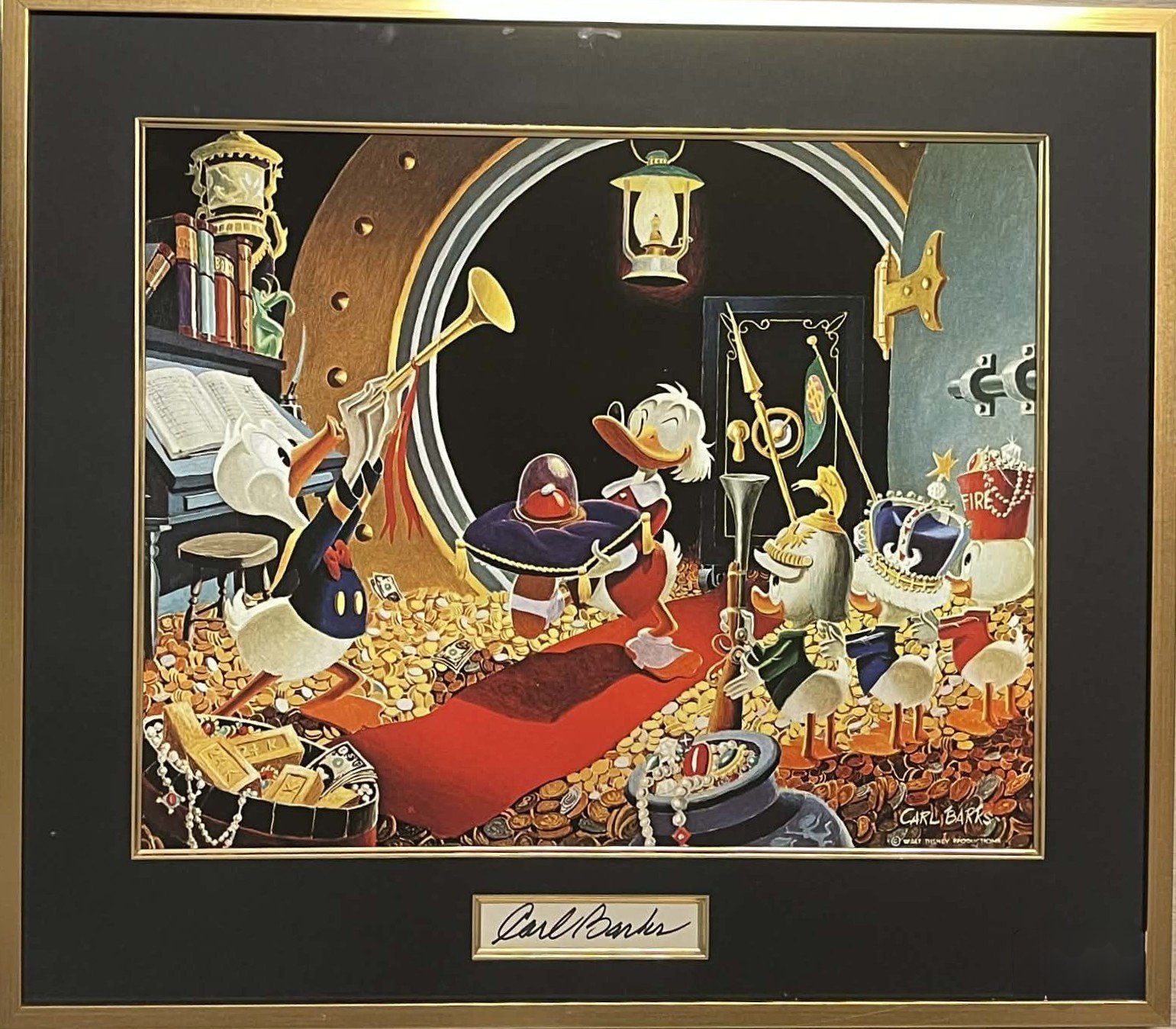 The Carl Barks Signature Edition by Gallery Disneyana+ is a new limited edition series consisting of a total 100 specially selected prints matched with an original oversize Carl Barks signature. The aim of this special edition is to carry on Carl Barks’ artistic legacy as a supplement to the officially released lithographic Carl Barks editions. The CBSE will thus not contain images or scenes previously released in another limited edition lithographic format. Each print is individually numbered on the reverse of the frame and accompanied by an identically numbered and individually titled CoA from Gallery Disneyana+ documenting the origin of the Carl Barks signature. The scene offered here is titled ‘Much Ado About a Dime’. This is a high-end, exclusive fine-art giclée print professionally framed in our exclusive frame with museum-quality glass to a total size of approx 52 x 64 cm.