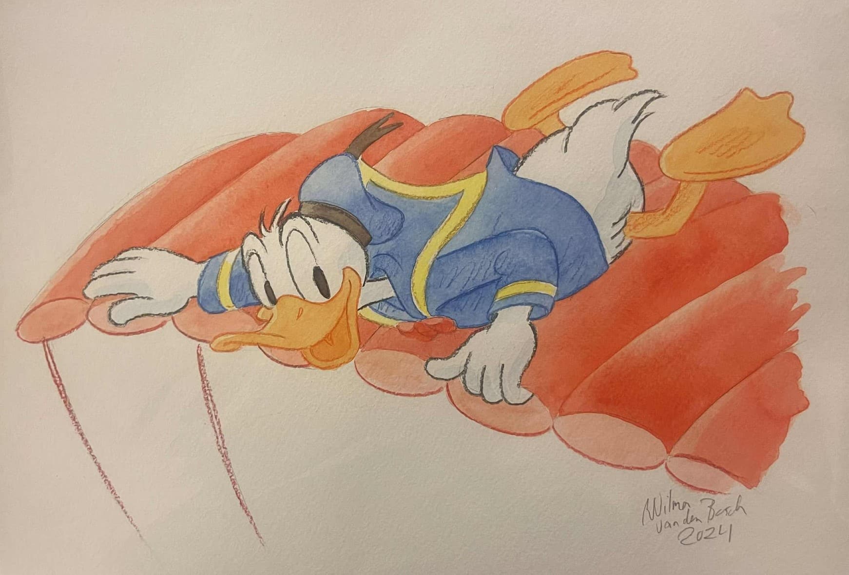 Beautiful original watercolour by Wilma van den Bosch created as part of Galleri Disneyana+’s celebration of Donald Duck’s 90th anniversary. The watercolour is rendered on high-quality art paper and measures approx. 29 x 21 cm. It is hand-signed and dated by Wilma van den Bosch in pencil.