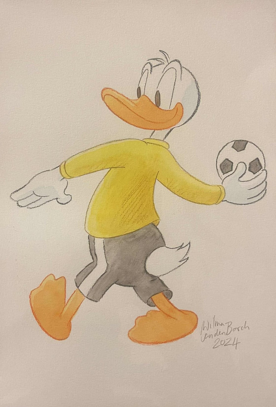 Beautiful original watercolour by Wilma van den Bosch created as part of Galleri Disneyana+’s celebration of Donald Duck’s 90th anniversary. The watercolour is rendered on high-quality art paper and measures approx. 29 x 21 cm. It is hand-signed and dated by Wilma van den Bosch in pencil.