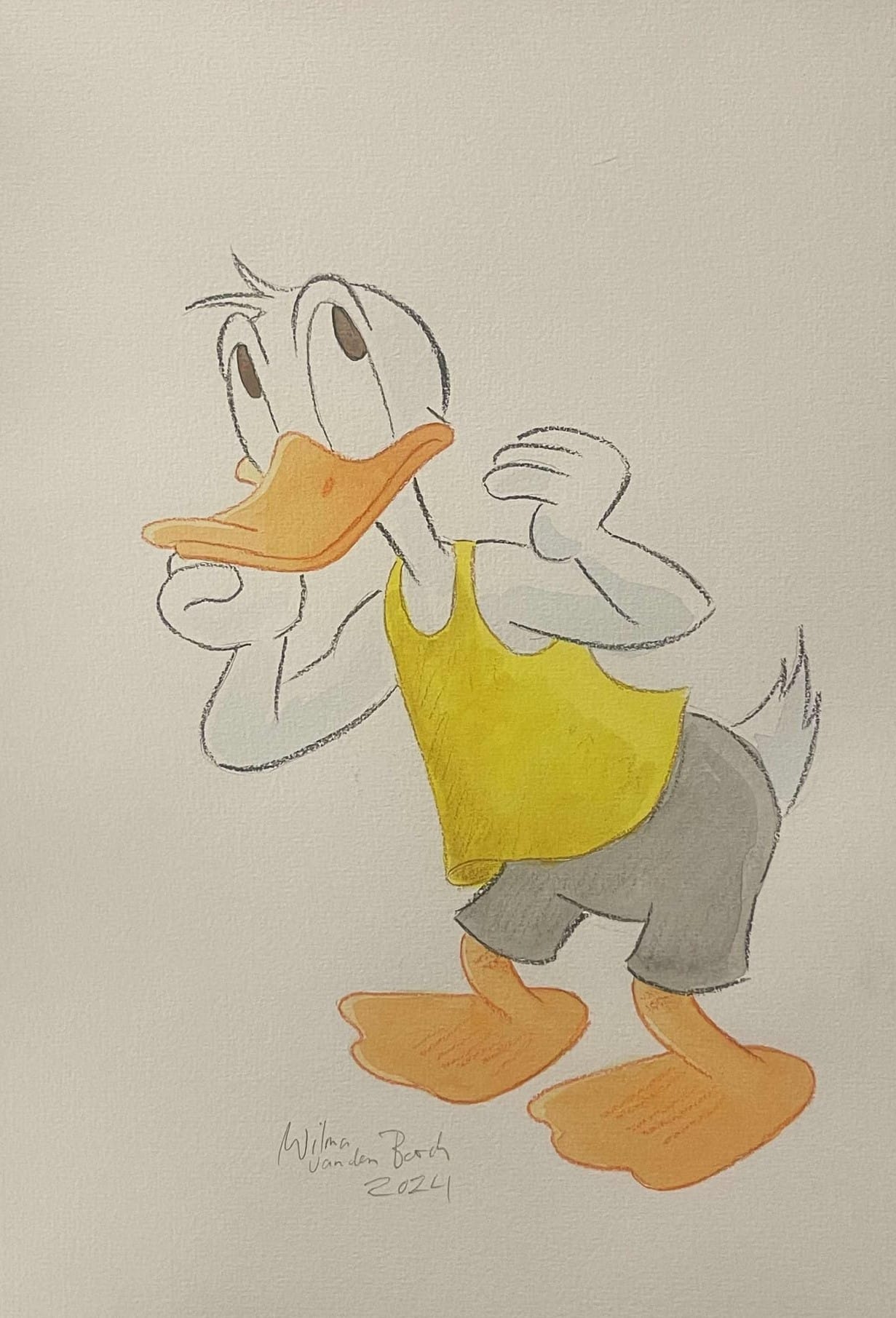 Beautiful original watercolour by Wilma van den Bosch created as part of Galleri Disneyana+’s celebration of Donald Duck’s 90th anniversary. The watercolour is rendered on high-quality art paper and measures approx. 29 x 21 cm. It is hand-signed and dated by Wilma van den Bosch in pencil.