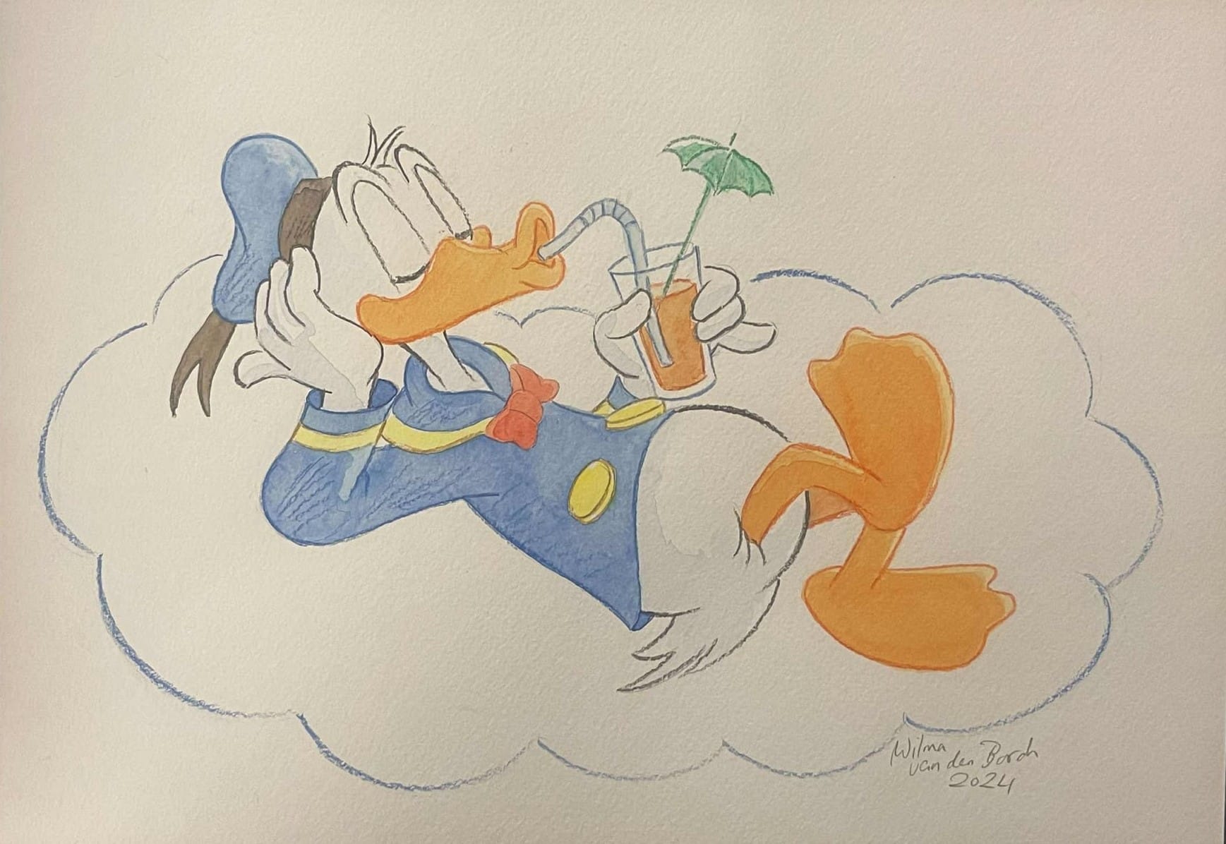 Beautiful original watercolour by Wilma van den Bosch created as part of Galleri Disneyana+’s celebration of Donald Duck’s 90th anniversary. The watercolour is rendered on high-quality art paper and measures approx. 29 x 21 cm. It is hand-signed and dated by Wilma van den Bosch in pencil.