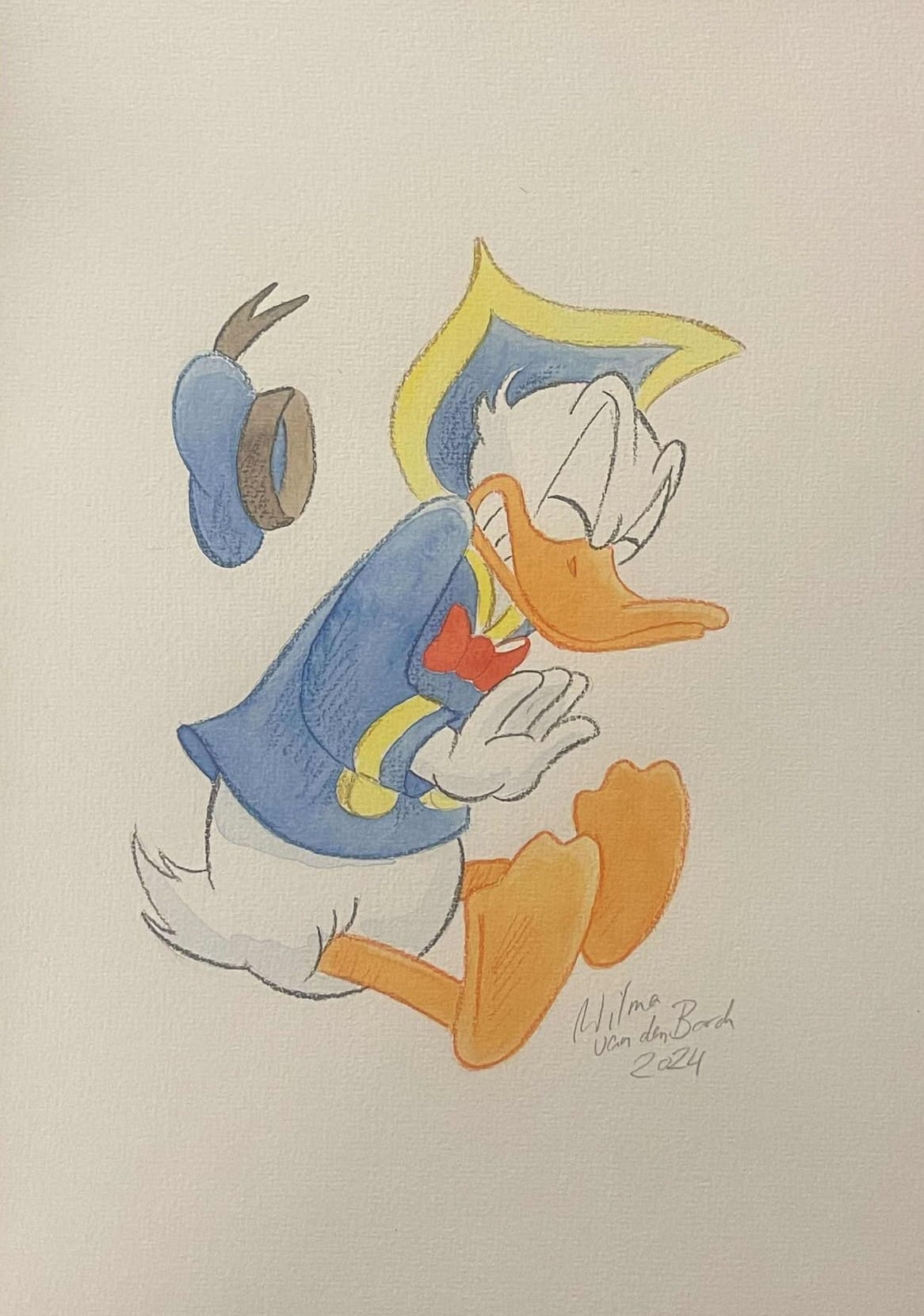 Beautiful original watercolour by Wilma van den Bosch created as part of Galleri Disneyana+’s celebration of Donald Duck’s 90th anniversary. The watercolour is rendered on high-quality art paper and measures approx. 29 x 21 cm. It is hand-signed and dated by Wilma van den Bosch in pencil.