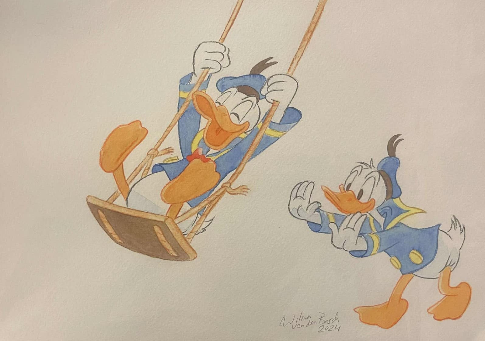 Beautiful original watercolour by Wilma van den Bosch created as part of Galleri Disneyana+’s celebration of Donald Duck’s 90th anniversary. The watercolour is rendered on high-quality art paper and measures approx. 29 x 21 cm. It is hand-signed and dated by Wilma van den Bosch in pencil.