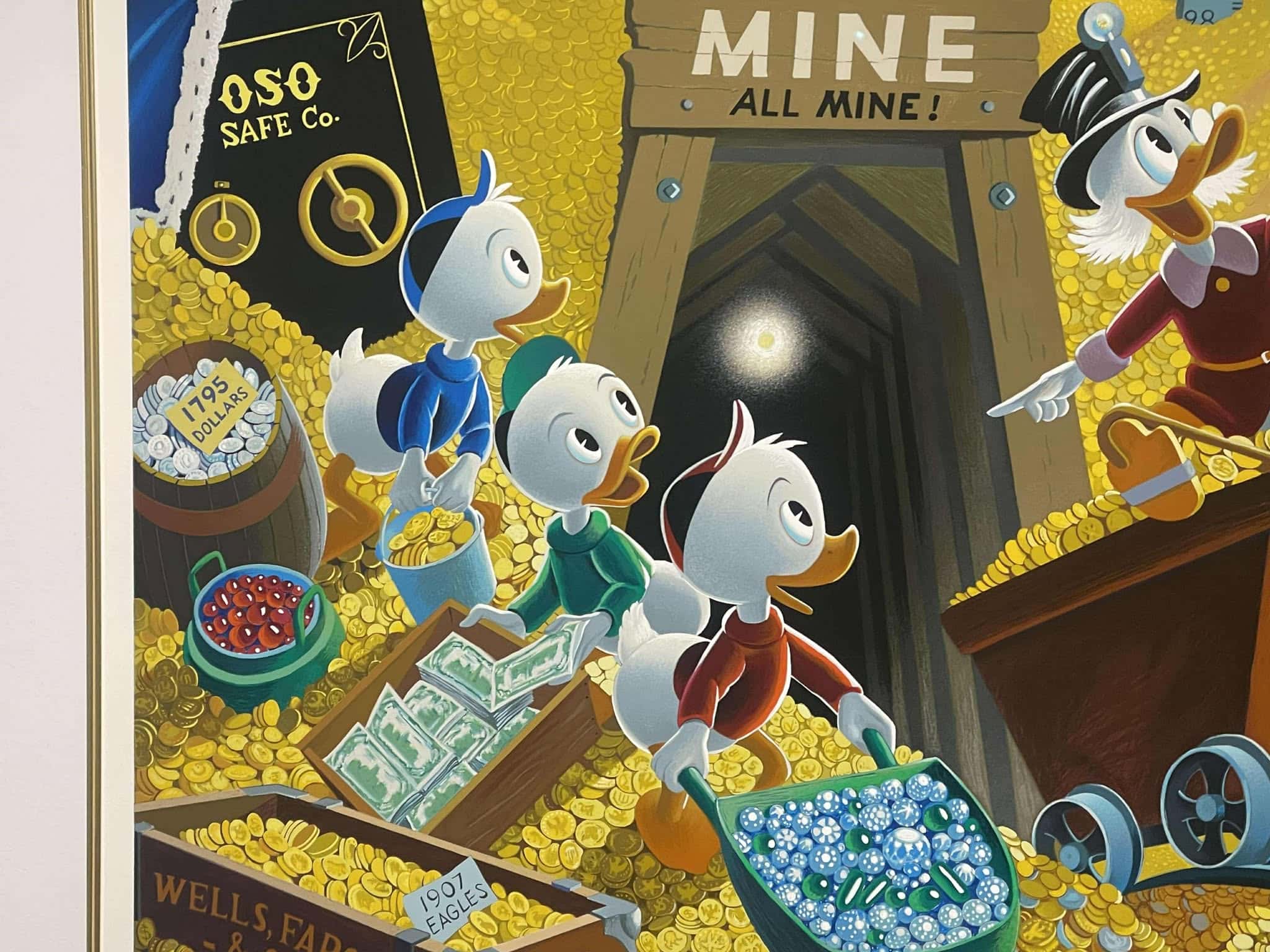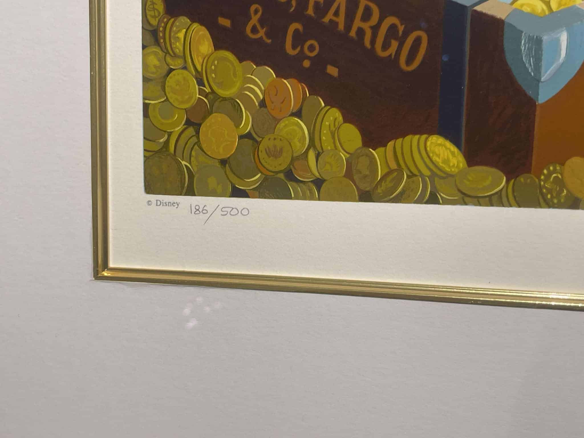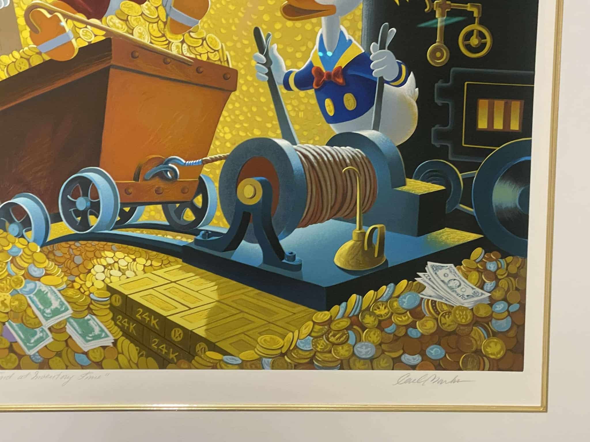 Rich Find at Inventory Time is the second release in the exclusive Disney Art Edition series of Carl Barks fine art serigraphs based on Barks’ oil paintings. This scene is a superb study in gold featuring the five main Disney ducks in the money bin. It consists of a staggering 75 hand-applied colour layers and was released in 1994. It is numbered 186/500 and hand-signed by Carl Barks. This beautiful investment-grade artwork is professionally framed and matted behind museum-quality glass to a staggering total size of approx. 107 x 93 cm. The serigraph is accompanied by the original certificate of authenticty from Disney Art Editions.