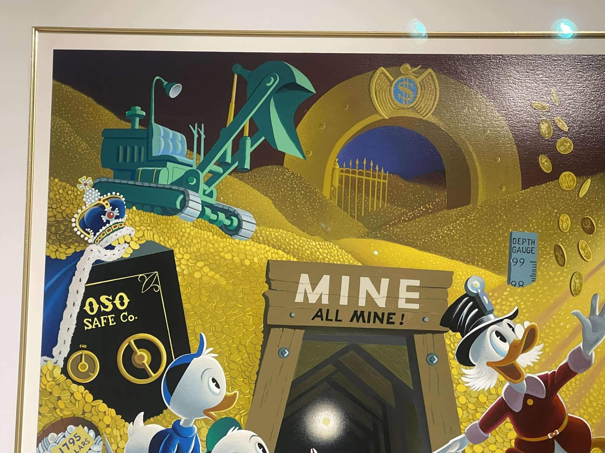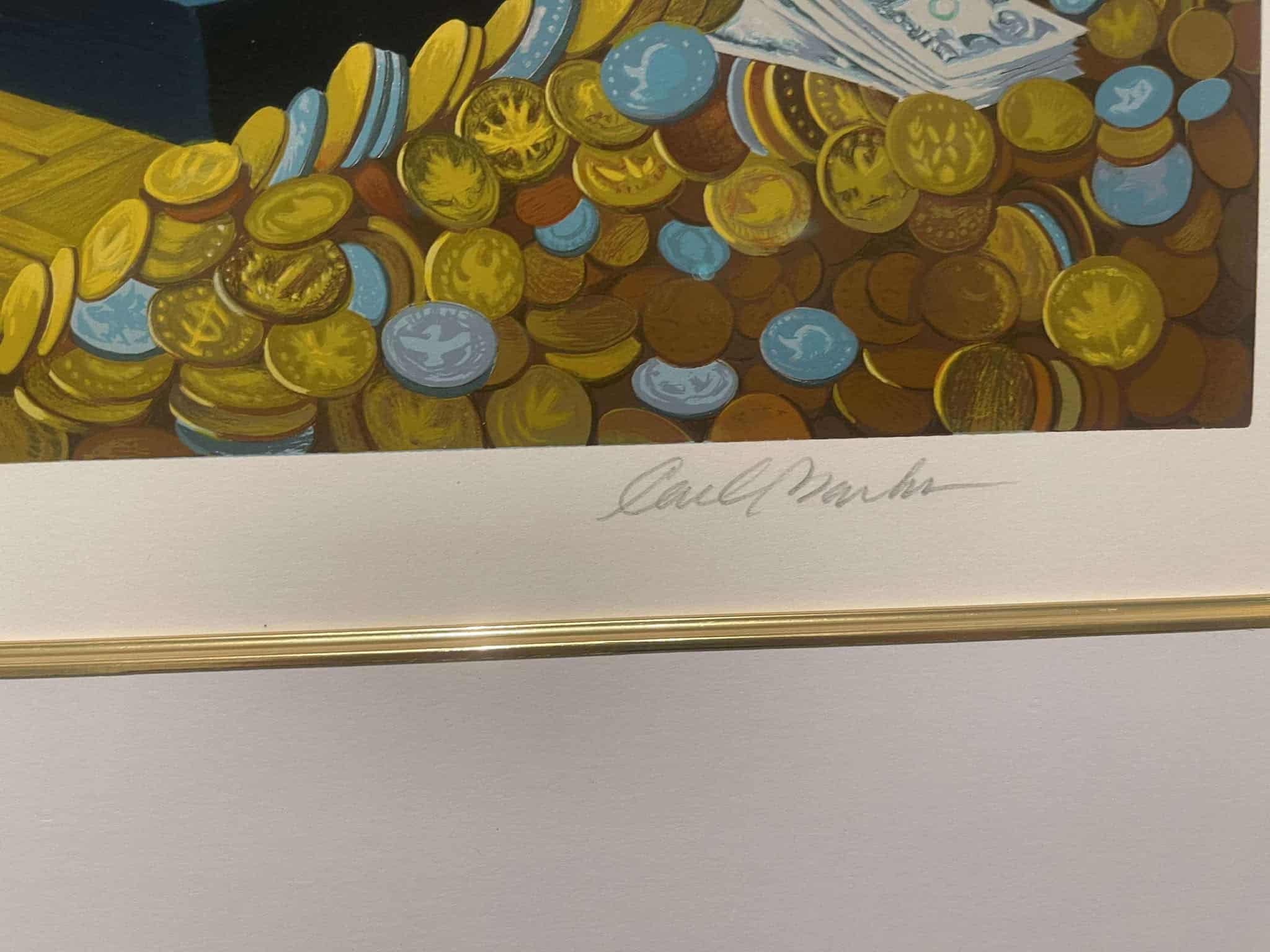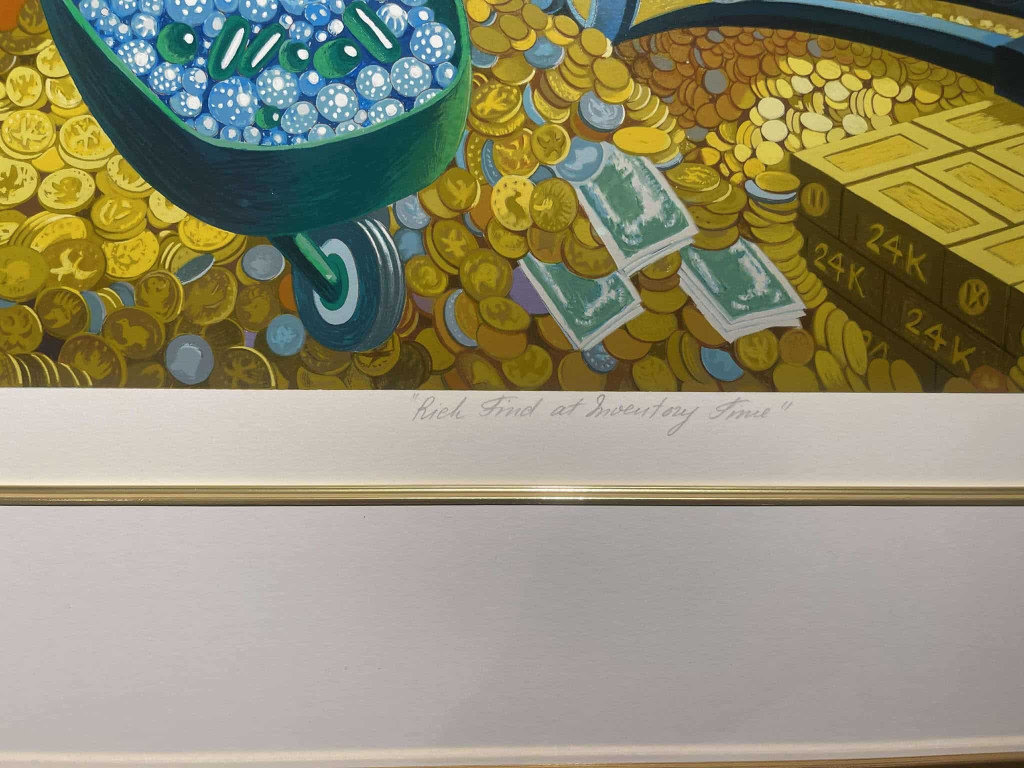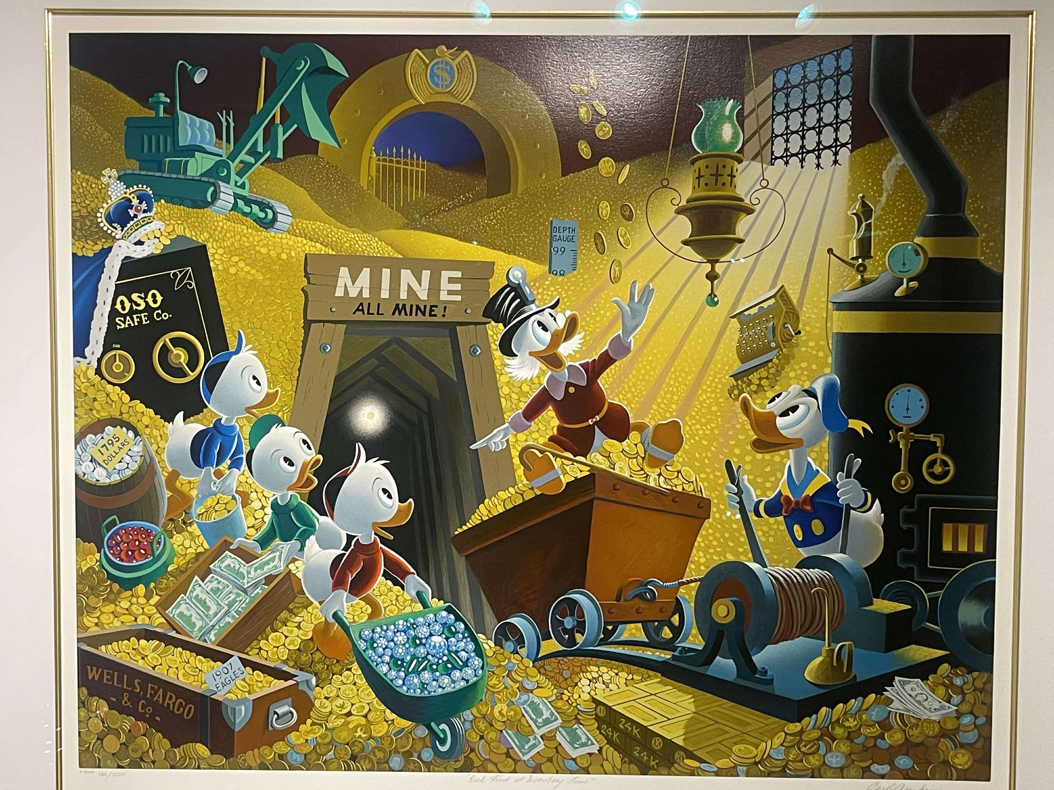 Rich Find at Inventory Time is the second release in the exclusive Disney Art Edition series of Carl Barks fine art serigraphs based on Barks’ oil paintings. This scene is a superb study in gold featuring the five main Disney ducks in the money bin. It consists of a staggering 75 hand-applied colour layers and was released in 1994. It is numbered 186/500 and hand-signed by Carl Barks. This beautiful investment-grade artwork is professionally framed and matted behind museum-quality glass to a staggering total size of approx. 107 x 93 cm. The serigraph is accompanied by the original certificate of authenticty from Disney Art Editions.