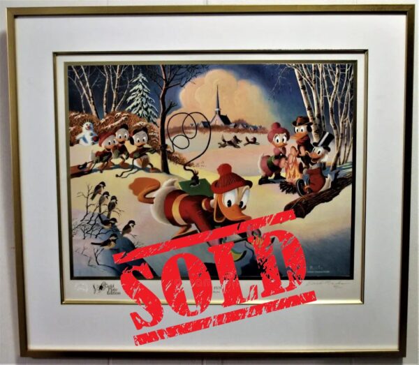 Gold Plate Edition lithograph in perfect (mint) condition. Released in 1990 and signed and numbered 25/100. Accompanied by the original certificate of authenticity. Professionally framed in the trademarked exclusive Gallery Disneyana+ gold frame to a total size of approx. 65 x 75 cm.