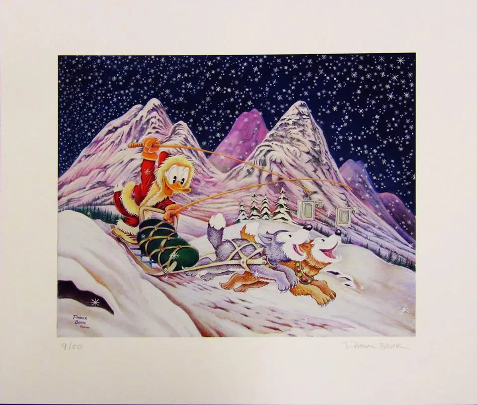 This fine-art giclée is printed from Patrick Block’s original oil painting of the same name, which is again based on the cover for Carl Barks’ last story titled Somewhere in Nowhere, which he made in collaboration with Patrick. The gclée is printed in a single edition of only 50 signed and numbered prints on exclusive 310 gr. Arches Aquarelle deluxe paper measuring a total of 36 x 40 cm. The print is accompanied by an identically numbered and signed certificate of authenticity. We have said it before: Nobody paints Disney winter images as good as Patrick, which is clearly seen here. The composition and color selection are simply perfect!