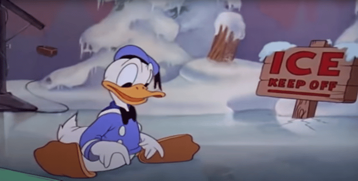 Donald finds himself on ice in this short which was filled to the brim with cartoon images of Hollywood celebrities like Harpo Marx, Mickey Rooney, Clark Gable, and Greta Garbo. In this scene, Donald is about to meet skating sensation Sonja Henie.