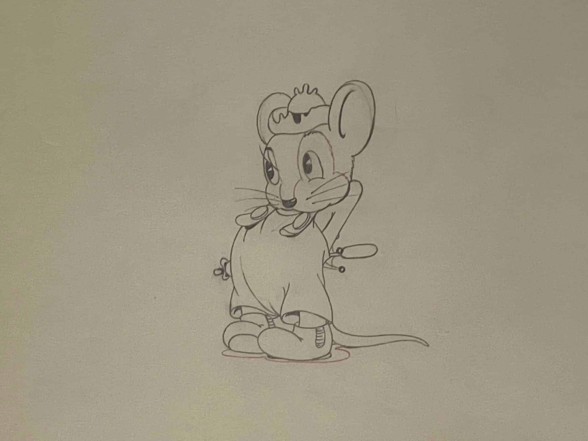 This lovely animation drawing of Abner Countrymouse was used in the award-winning Silly Symphony The Country Cousin. This Wilfred Jackson-directed short was loosely based on one of Aesop’s fables, “The Town Mouse and the Country Mouse”, and followed Abner as he visited his cousin in the big city so he could “stop being a hick”.