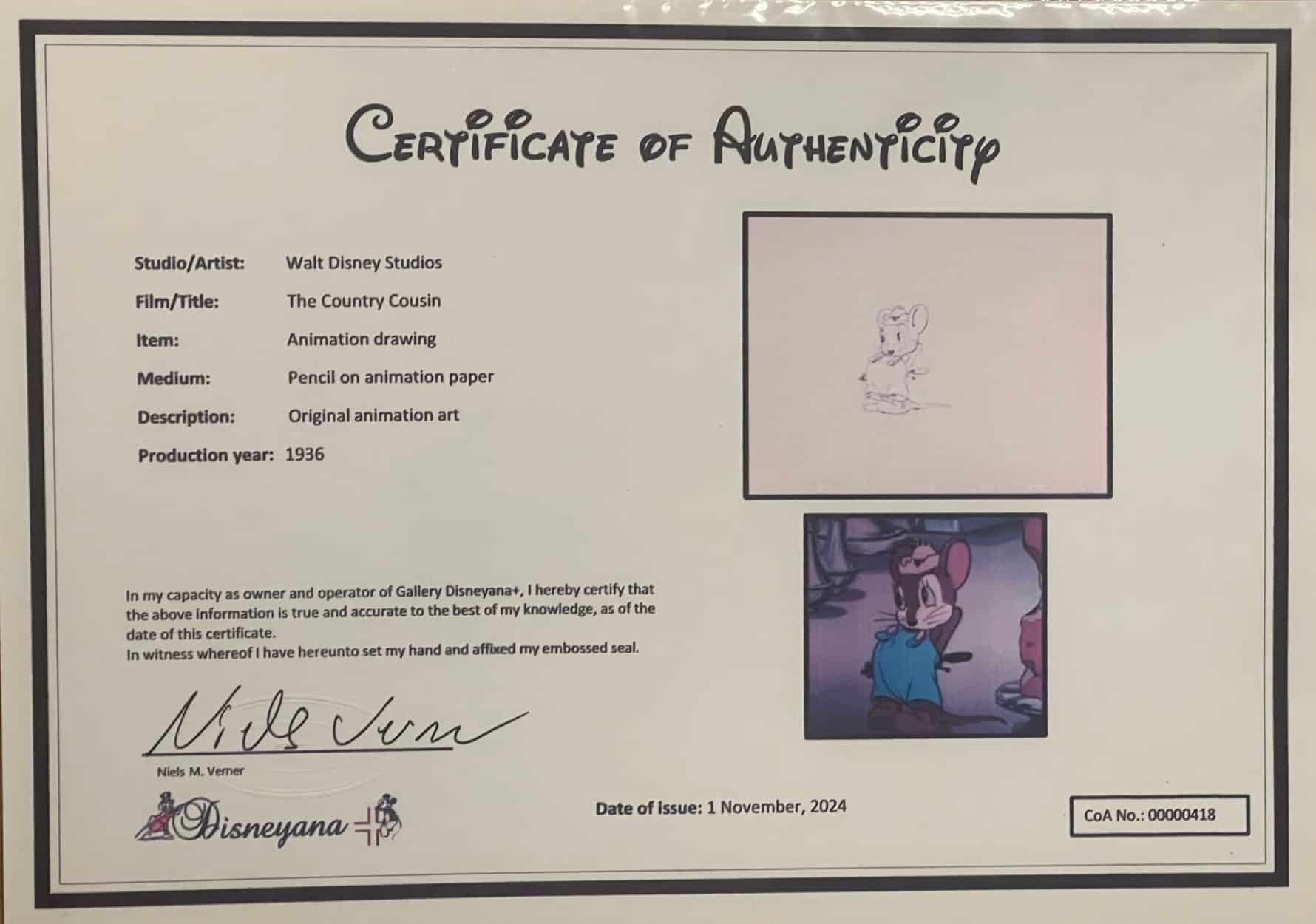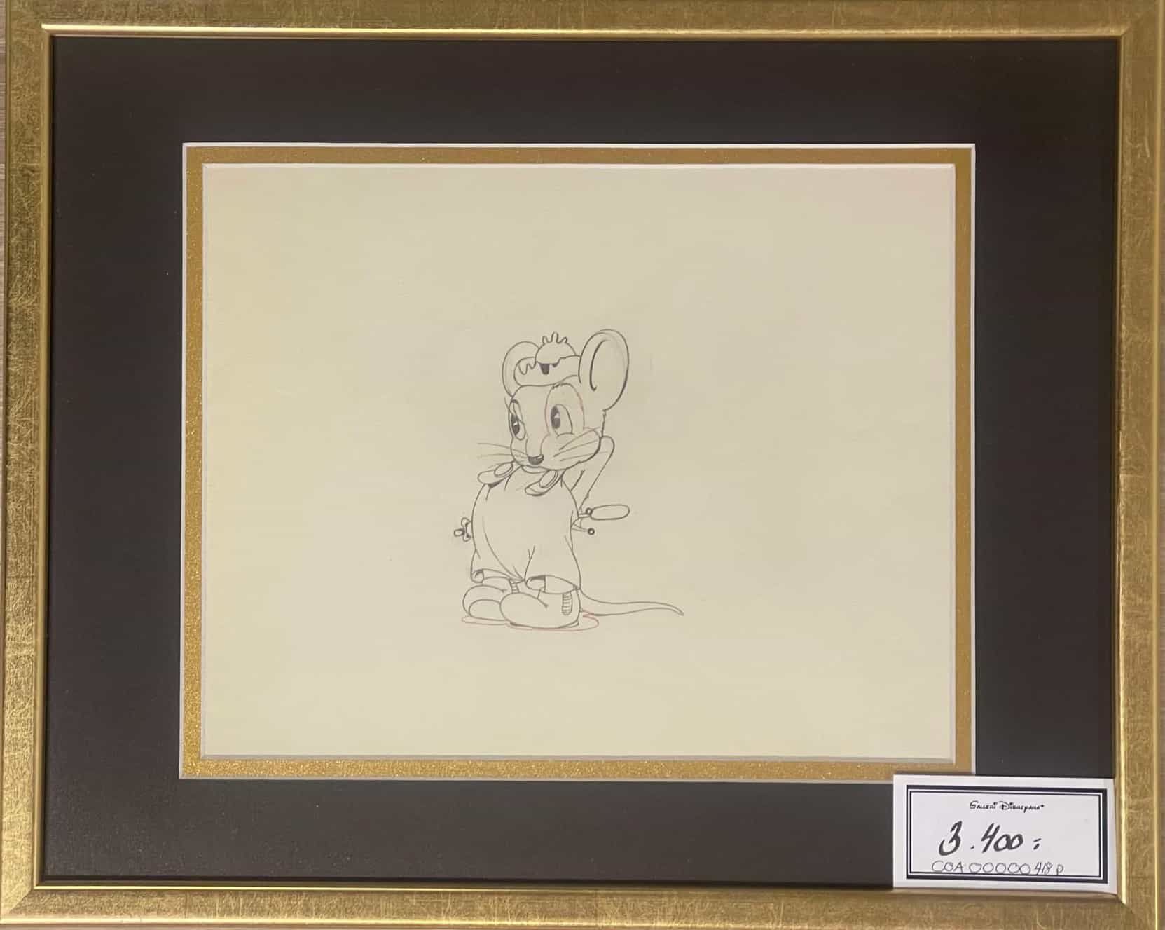 The drawing comes in a custom frame with double mat and museum quality glass measuring a total of 37 x 30 cm. Each drawing comes with a certificate of authenticity from Gallery Disneyana+.
